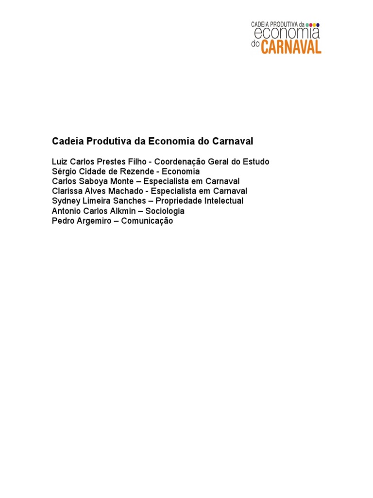 Luiz Carlos Prestes Filho - Coordenao Geral do Estudo Srgio Cidade de Rezende - Economia Carlos Saboya Monte Especialista em Carnaval Clarissa Alves Machado - Especialista em Carnaval Sydney Limeira Sanches Propriedade Intelectual Antonio Carlos Alkmin Sociologia Pedro Argemiro Comunicao