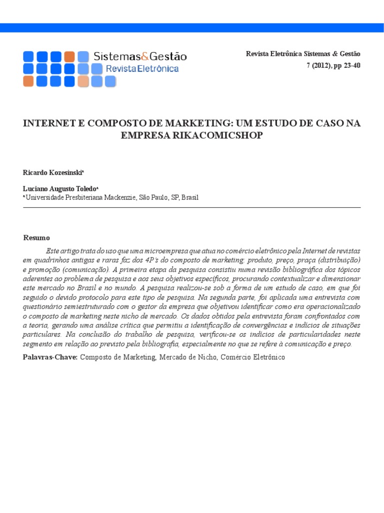Este artigo trata do uso que uma microempresa que atua no comércio eletrônico pela Internet de revistas em quadrinhos antigas e raras faz dos 4P’s do composto de marketing: produto, preço, praça (distribuição) e promoção (comunicação). A primeira etapa da pesquisa consistiu numa revisão bibliográfica dos tópicos aderentes ao problema de pesquisa e aos seus objetivos específicos, procurando contextualizar e dimensionar este mercado no Brasil e no mundo. A pesquisa realizou-se sob a forma de um estudo de caso, em que foi seguido o devido protocolo para este tipo de pesquisa. Na segunda parte, foi aplicada uma entrevista com questionário semiestruturado com o gestor da empresa que objetivou identificar como era operacionalizado o composto de marketing neste nicho de mercado. Os dados obtidos pela entrevista foram confrontados com a teoria, gerando uma análise crítica que permitiu a identificação de convergências e indícios de situações particulares. Na conclusão do trabalho de pesquisa, verificou-se os indícios de particularidades neste segmento em relação ao previsto pela bibliografia, especialmente no que se refere à comunicação e preço.