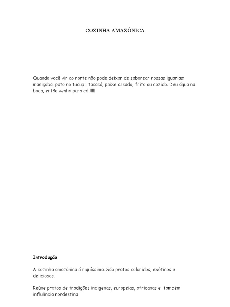 Introduo A cozinha amaznica riqussima. So pratos coloridos, exticos e deliciosos. Rene pratos de tradies indgenas, europias, africanas e tambm influncia nordestina