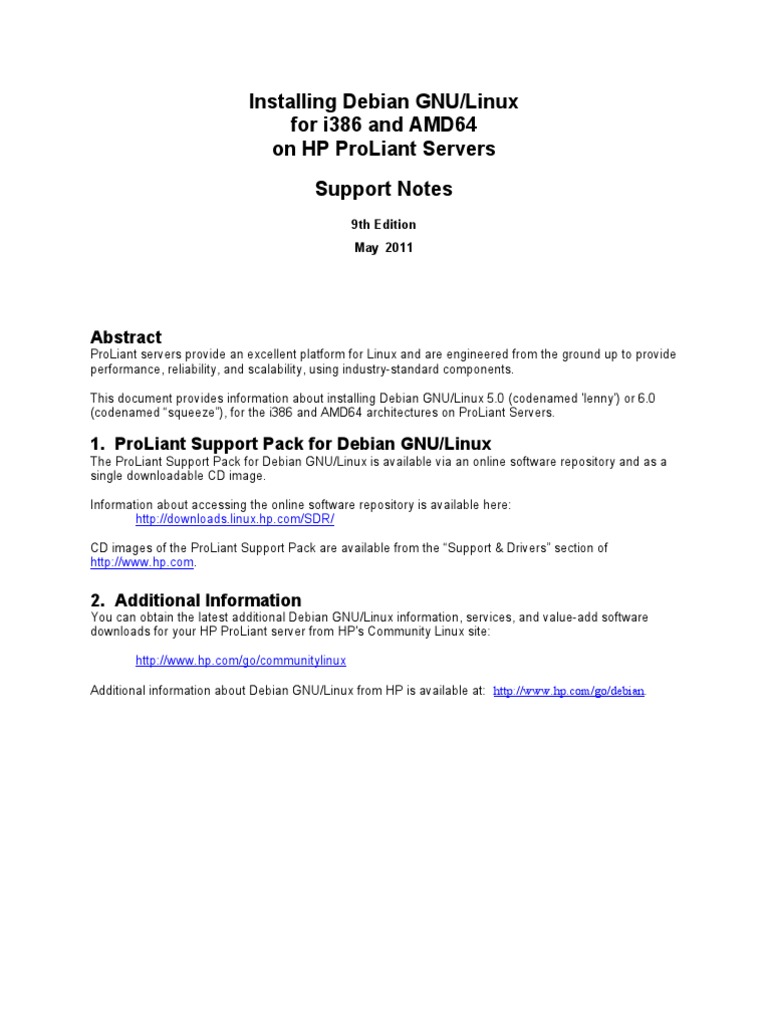 ProLiant servers provide an excellent platform for Linux and are engineered from the ground up to provide performance, reliability, and scalability, using industry-standard components. This document provides information about installing Debian GNU/Linux 5.0 (codenamed 'lenny') or 6.0 (codenamed squeeze), for the i386 and AMD64 architectures on ProLiant Servers.