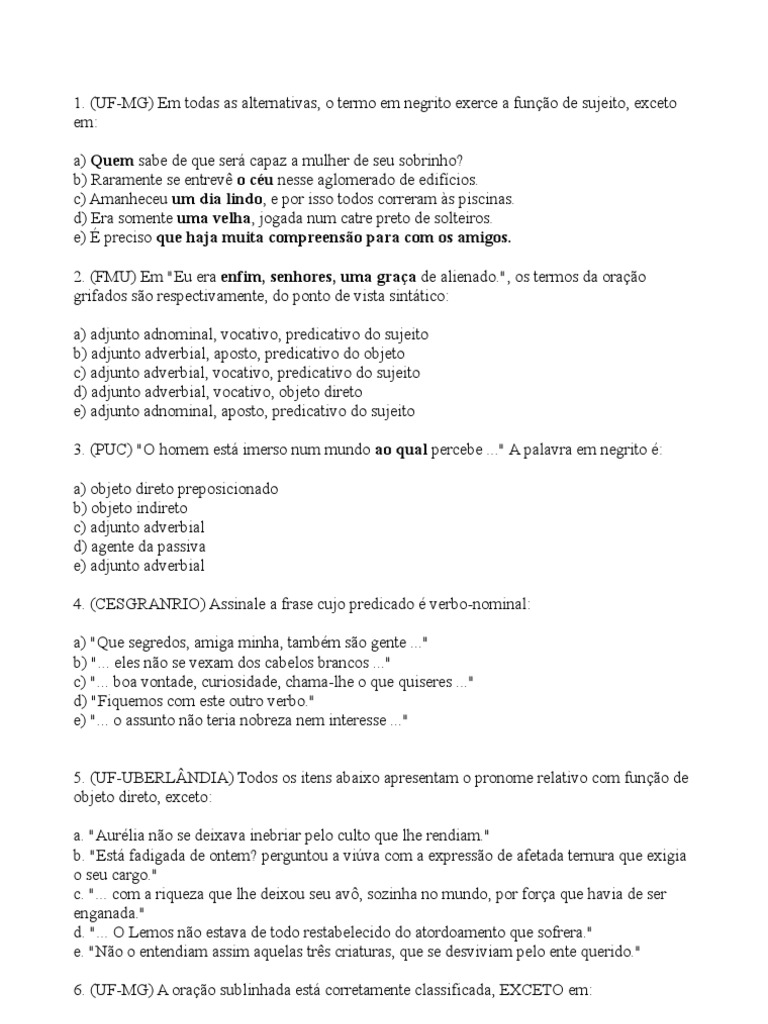 (UF-MG) Em todas as alternativas, o termo em negrito exerce a funo de sujeito, exceto em: a) Quem sabe de que ser capaz a mulher de seu sobrinho? b) Raramente se entrev o cu nesse aglomerado de edifcios. c) Amanheceu um dia lindo, e por isso todos correram s piscinas. d) Era somente uma velha, jogada num catre preto de solteiros. e) preciso que haja muita compreenso para com os amigos. 2. (FMU) Em "Eu era enfim, senhores, uma graa de alienado.", os termos da orao grifados so respectivamente, do ponto de vista sinttico: a) adjunto adnominal, vocativo, predicativo do sujeito b) adjunto adverbial, aposto, predicativo do objeto c) adjunto adverbial, vocativo, predicativo do sujeito d) adjunto adverbial, vocativo, objeto direto e) adjunto adnominal, aposto, predicativo do sujeito 3. (PUC) "O homem est imerso num mundo ao qual percebe ..." A palavra em negrito : a) objeto direto preposicionado b) objeto indireto c) adjunto adverbial d) agente da passiva e) adjunto adverbial 4. (CESGRANRIO) Assinale a frase cujo predicado verbo-nominal: a) "Que segredos, amiga minha, tambm so gente ..." b) "... eles no se vexam dos cabelos brancos ..." c) "... boa vontade, curiosidade, chama-lhe o que quiseres ..." d) "Fiquemos com este outro verbo." e) "... o assunto no teria nobreza nem interesse ..." 5. (UF-UBERLNDIA) Todos os itens abaixo apresentam o pronome relativo com funo de objeto direto, exceto: a. "Aurlia no se deixava inebriar pelo culto que lhe rendiam." b. "Est fadigada de ontem? perguntou a viva com a expresso de afetada ternura que exigia o seu cargo." c. "... com a riqueza que lhe deixou seu av, sozinha no mundo, por fora que havia de ser enganada." d. "... O Lemos no estava de todo restabelecido do atordoamento que sofrera." e. "No o entendiam assim aquelas trs criaturas, que se desviviam pelo ente querido." 6. (UF-MG) A orao sublinhada est corretamente classificada, EXCETO em: