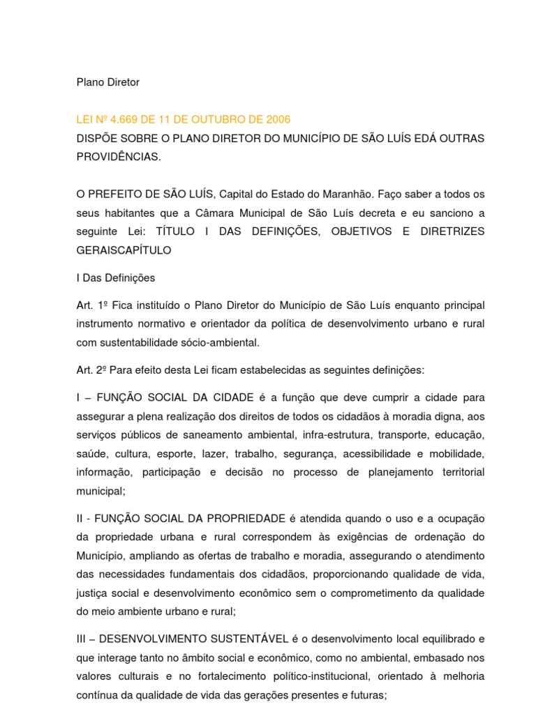 O PREFEITO DE SO LUS, Capital do Estado do Maranho. Fao saber a todos os seus habitantes que a Cmara Municipal de So Lus decreta e eu sanciono a seguinte Lei: TTULO I DAS DEFINIES, OBJETIVOS E DIRETRIZES GERAISCAPTULO I Das Definies Art. 1 Fica institudo o Plano Diretor do Municpio de So Lus enquanto principal instrumento normativo e orientador da poltica de desenvolvimento urbano e rural com sustentabilidade scio-ambiental. Art. 2 Para efeito desta Lei ficam estabelecidas as seguintes definies: I FUNO SOCIAL DA CIDADE a funo que deve cumprir a cidade para assegurar a plena realizao dos direitos de todos os cidados moradia digna, aos servios pblicos de saneamento ambiental, infra-estrutura, transporte, educao, sade, cultura, esporte, lazer, trabalho, segurana, acessibilidade e mobilidade, informao, participao e deciso no processo de planejamento territorial municipal; II - FUNO SOCIAL DA PROPRIEDADE atendida quando o uso e a ocupao da propriedade urbana e rural correspondem s exigncias de ordenao do Municpio, ampliando as ofertas de trabalho e moradia, assegurando o atendimento das necessidades fundamentais dos cidados, proporcionando qualidade de vida, justia social e desenvolvimento econmico sem o comprometimento da qualidade do meio ambiente urbano e rural; III DESENVOLVIMENTO SUSTENTVEL o desenvolvimento local equilibrado e que interage tanto no mbito social e econmico, como no ambiental, embasado nos valores culturais e no fortalecimento poltico-institucional, orientado melhoria contnua da qualidade de vida das geraes presentes e futuras;