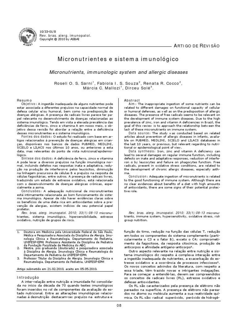 Objetivo: A ingesto inadequada de alguns nutrientes pode estar associada a diferentes prejuzos na capacidade normal de defesa celular e/ou humoral, bem como na predisposio de doenas alrgicas. A presena de radicais livres parece ter papel relevante no desenvolvimento de doenas relacionadas ao sistema imunolgico. Tendo em vista a elevada prevalncia das deficincias de ferro, zinco e vitamina A em nosso meio, o objetivo dessa reviso foi abordar a relao entre a deficincia desses micronutrientes e o sistema imunolgico. Fontes dos dados: O estudo foi realizado com base em artigos relacionados preveno de doenas alrgicas em crianas, disponveis nos bancos de dados PUBMED, MEDLINE, SCIELO e LILACS nos ltimos 10 anos, ou anteriores a esta data, mas relevantes do ponto de vista nutricional/epidemiolgico. Sntese dos dados: A deficincia de ferro, zinco e vitamina A pode levar a diversos prejuzos na funo imunolgica normal, incluindo defeitos nas respostas inata e adaptativa, reduo na produo de interferon- pelos leuccitos, diminuio na linhagem precursora de clulas B e prejuzo na resposta de clulas fagocitrias, entre outros. A presena de radicais livres, traduzindo um estado de estresse oxidativo, est relacionada com o desenvolvimento de doenas alrgicas crnicas, especialmente a asma. Concluses: A adequao nutricional de micronutrientes est intimamente relacionada ao bom funcionamento do sistema imunolgico. Apesar de no haver evidncias claras sobre os benefcios de uma dieta rica em antioxidantes sobre a preveno de alergias, existem indcios de seu potencial papel protetor. Rev. bras. alerg. imunopatol. 2010; 33(1):08-13 micronutrientes, sistema imunolgico, hipersensibilidade, estresse oxidativo, nutrio de grupos de risco.