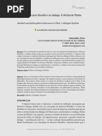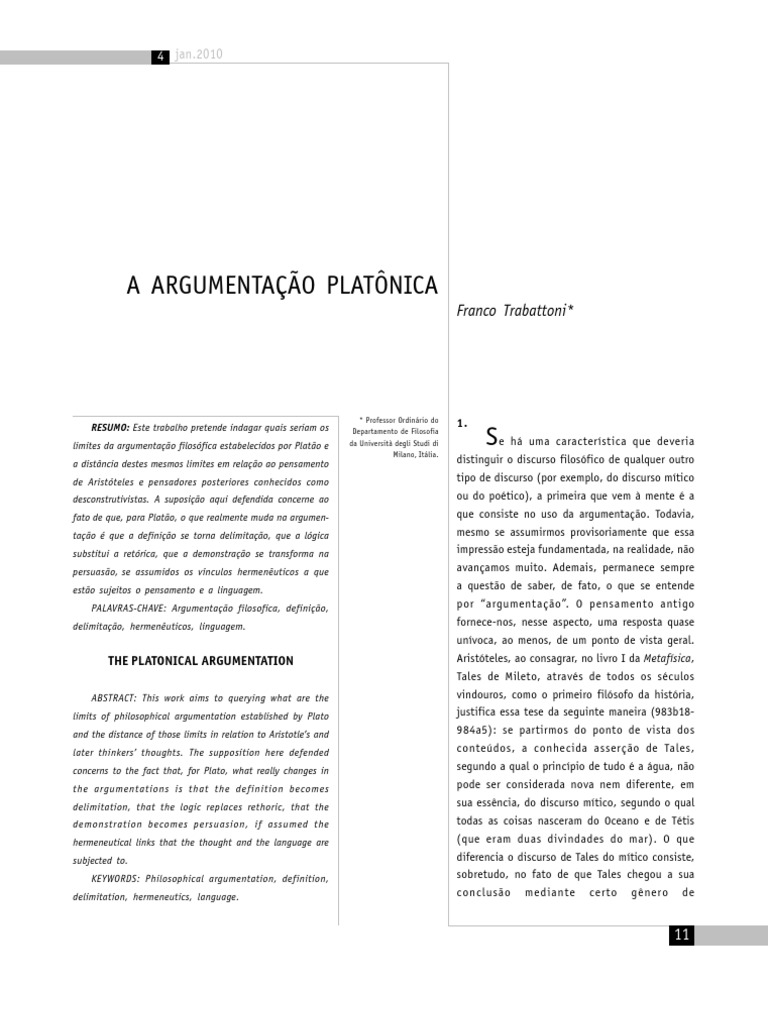 RESUMO: Este trabalho pretende indagar quais seriam os limites da argumentao filosfica estabelecidos por Plato e a distncia destes mesmos limites em relao ao pensamento de Aristteles e pensadores posteriores conhecidos como desconstrutivistas. A suposio aqui defendida concerne ao fato de que, para Plato, o que realmente muda na argumentao que a definio se torna delimitao, que a lgica substitui a retrica, que a demonstrao se transforma na persuaso, se assumidos os vnculos hermenuticos a que esto sujeitos o pensamento e a linguagem. PALAVRAS-CHAVE: Argumentao filosofica, definio, delimitao, hermenuticos, linguagem.