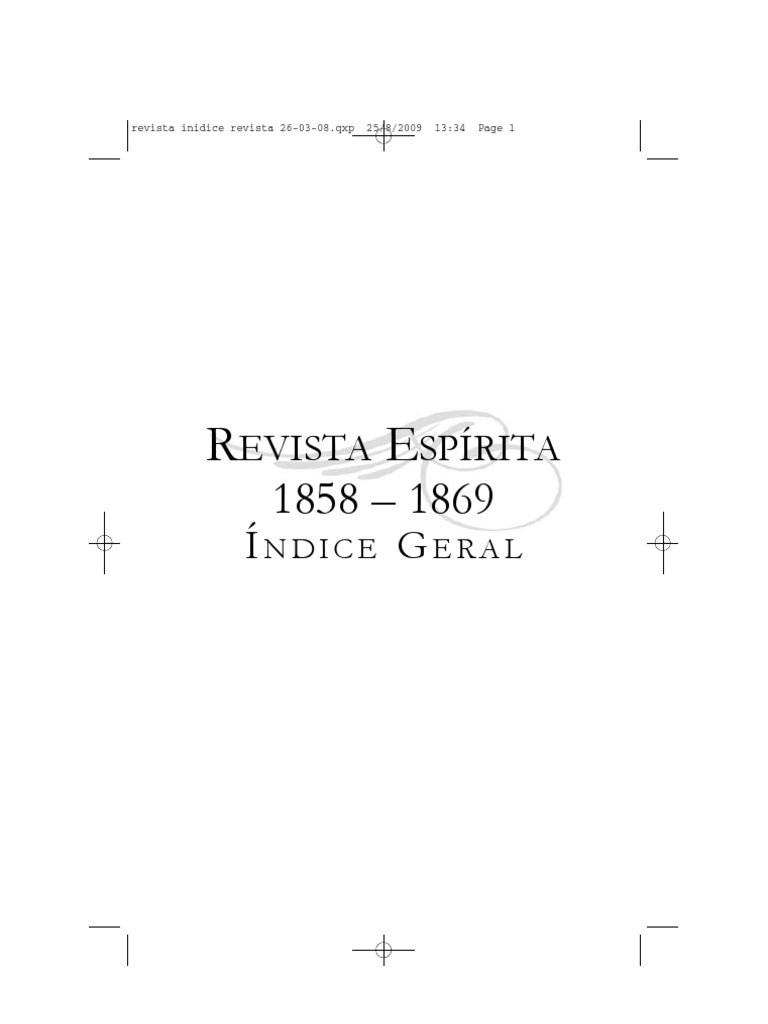 Jpiter e a durao da maio 1858, p. 221 modo de manifestao da jul. 1869, p. 303 nada e nov. 1860, p. 514 princpio constituinte da dez. 1869, p. 497 Terra e diversidade da mar. 1858, p. 111 Universo e * inteligente mar. 1858, p. 112 Vnus e a durao da ago. 1862, p. 336 VIDA ANTERIOR conseqncias de uma set. 1861, p. 397 VIDA APS A MORTE Ciro e a maio 1864, p. 216 desejo nato no homem e dez. 1860, p. 538 Ernest Renan e maio 1864, p. 186 VIDA ATUAL ideais de vidas passadas e mar. 1862, p. 111 VIDA CORPORAL erraticidade e mar. 1859, p. 107 Esprito e necessidade da jul. 1862, p. 273 finalidade da abr. 1859, p. 137 insuficincia da unicidade da mar. 1865, p. 101 objetivo do prolongamento da nov. 1865, p. 448 objetivos da set. 1867, p. 374 princpio da unicidade da jun. 1861, p. 283 soluo de continuidade na jun. 1869, p. 229 utilidade da jun. 1869, p. 229 vicissitudes da abr. 1859, p. 139 vida esprita e mar. 1859, p. 111; abr. 1859, p. 137 vida espiritual e extino da nov. 1867, p. 453