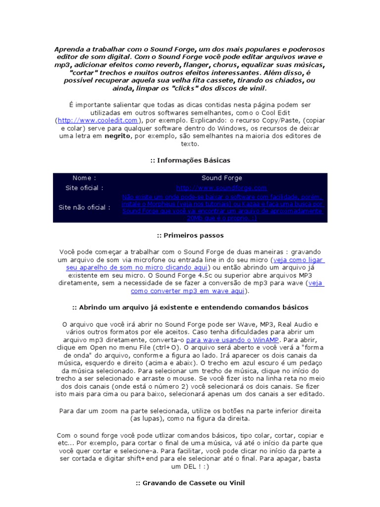 Com o Sound Forge voc pode editar arquivos wave e mp3, adicionar efeitos como reverb, flanger, chorus, equalizar suas msicas, "cortar" trechos e muitos outros efeitos interessantes. Alm disso, possvel recuperar aquela sua velha fita cassete, tirando os chiados, ou ainda, limpar os "clicks" dos discos de vinil. importante salientar que todas as dicas contidas nesta pgina podem ser utilizadas em outros softwares semelhantes, como o Cool Edit ([Link] por exemplo. Explicando: o recurso Copy/Paste, (copiar e colar) serve para qualquer software dentro do Windows, os recursos de deixar uma letra em negrito, por exemplo, so semelhantes na maioria dos editores de texto. :: Informaes Bsicas Nome : Site oficial : Site no oficial : Sound Forge [Link]