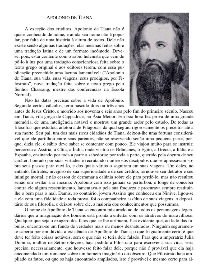 A exceção dos eruditos, Apolonio de Tiana não é quase conhecido de nome, e ainda seu nome não é popular, por falta de uma história à altura de todos. Dele não existe senão algumas traduções, elas mesmas feitas sobre uma tradução latina e de um formato incômodo. Devese, pois, estar contente com o sábio helenista que vem de pô-lo à luz por uma tradução conscienciosa feita sobre o texto grego original e aos editores terem, com essa publicação preenchido uma lacuna lamentável: (“Apolonio de Tiana, sua vida, suas viagens, seus prodígios, por Filostrato”, nova tradução feita sobre o texto grego pelo Senhor Chassang, mestre das conferencias na Escola Normal). Não há datas precisas sobre a vida de Apolônio. Segundo certos cálculos, teria nascido dois ou três anos antes de Jesus Cristo, e morrido aos noventa e seis anos pelo fim do primeiro século. Nasceu em Tiana, vila grega de Cappadoce, na Ásia Menor. Em boa hora fez prova de uma grande memória, de uma inteligência notável e mostrou um grande ardor pelo estudo. De todas as filosofias que estudou, adotou a de Pitágoras, da qual seguiu rigorosamente os preceitos até a sua morte. Seu pai, um dos mais ricos cidadãos de Tiana, deixou-lhe uma fortuna considerável que ele partilhou entre seus parentes, não se reservando senão uma pequena parte, porque, dizia ele, o sábio deve saber se contentar com pouco. Ele viajou muito para se instruir; percorreu a Assíria, a Cítia, a Índia, onde visitou os Brâmanes, o Egito, a Grécia, a Itália e a Espanha, ensinando por toda a parte a sabedoria; por toda a parte, querido pela doçura de seu caráter, honrado por suas virtudes e recrutando numerosos discípulos que se apressavam sobre seus passos para ouvi-lo, e dos quais vários o seguiram em suas viagens. Um deles, no entanto, Eufrates, invejoso de sua superioridade e de seu crédito, tornou-se seu detrator e seu inimigo mortal, e não cessou de derramar a calúnia sobre ele para perdê-lo, mas não resultou senão em aviltar a si mesmo; Apolônio com isso jamais se perturbou, e longe de conceber contra ele algum ressentimento, lamentava-o pela sua fraqueza e procurava sempre restituirlhe o bem para o mal. Damis, ao contrário, jovem Assírio que conheceu em Ninive, ligou-se a ele com uma fidelidade a toda prova, foi o companheiro assíduo de suas viagens, o depositário de sua filosofia, e deixou sobre ele, a maioria dos conhecimentos que possuímos. O nome de Apolônio de Tiana se encontra misturado ao de todos os personagens legendários que a imaginação dos homens está pronta a enfeitar com os atrativos do maravilhoso. Qualquer que seja o exagero dos fatos que se lhe atribuem, fica evidente que, ao lado das fabulas, encontra-se um fundo de verdades mais ou menos desnaturadas. Ninguém seguramente saberia por em dúvida a existência de Apolônio de Tiana; o que é igualmente certo é que deve ter feito coisas notáveis, sem o que não se teria dele falado. Para que a imperatriz Júlia Domma, mulher de Sétimo-Severo, haja pedido a Filostrato para escrever a sua vida, seria preciso, necessariamente, que houvesse feito falar dele, porque não é provável que ela haja encomendado um romance sobre um homem imaginário ou obscuro. Que Filostrato haja ampliado os fatos, ou que os haja encontrado ampliados, isto é provável e mesmo certo para al-