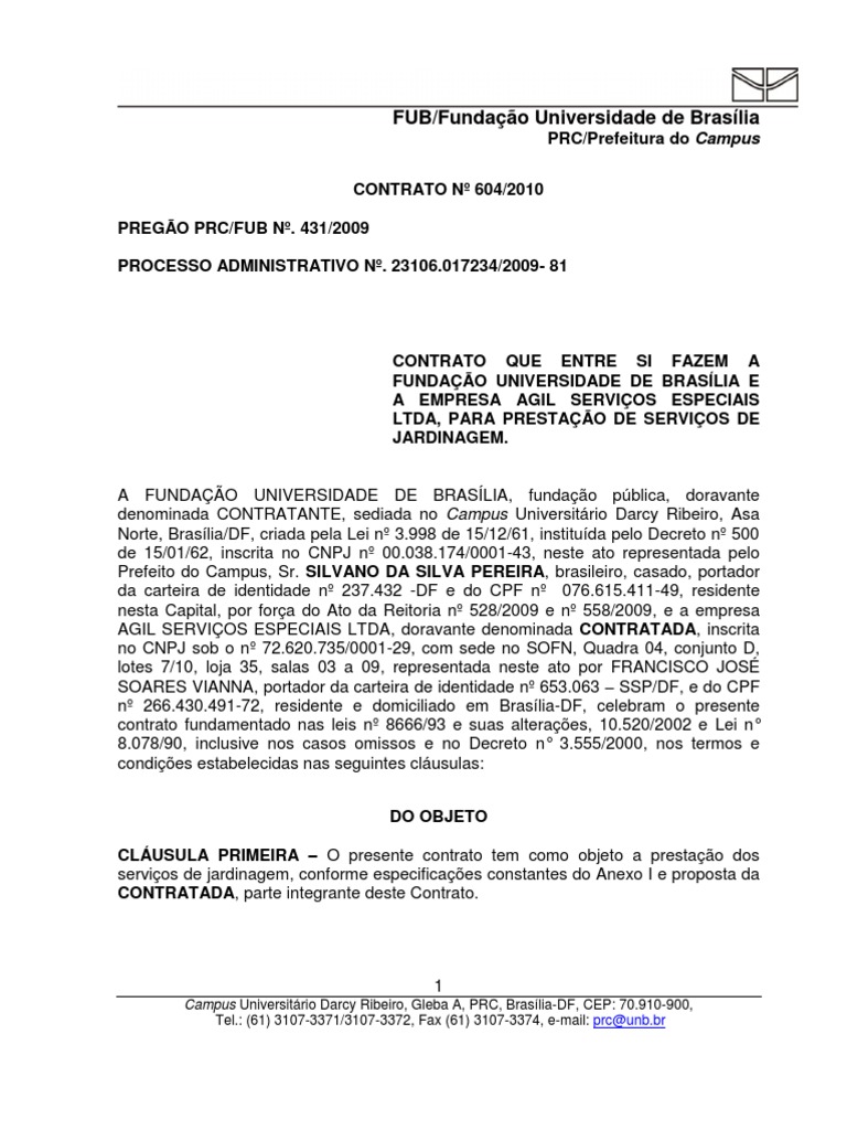 A FUNDAO UNIVERSIDADE DE BRASLIA, fundao pblica, doravante denominada CONTRATANTE, sediada no Campus Universitrio Darcy Ribeiro, Asa Norte, Braslia/DF, criada pela Lei n 3.998 de 15/12/61, instituda pelo Decreto n 500 de 15/01/62, inscrita no CNPJ n 00.038.174/0001-43, neste ato representada pelo Prefeito do Campus, Sr. SILVANO DA SILVA PEREIRA, brasileiro, casado, portador da carteira de identidade n 237.432 -DF e do CPF n 076.615.411-49, residente nesta Capital, por fora do Ato da Reitoria n 528/2009 e n 558/2009, e a empresa AGIL SERVIOS ESPECIAIS LTDA, doravante denominada CONTRATADA, inscrita no CNPJ sob o n 72.620.735/0001-29, com sede no SOFN, Quadra 04, conjunto D, lotes 7/10, loja 35, salas 03 a 09, representada neste ato por FRANCISCO JOS SOARES VIANNA, portador da carteira de identidade n 653.063 SSP/DF, e do CPF n 266.430.491-72, residente e domiciliado em Braslia-DF, celebram o presente contrato fundamentado nas leis n 8666/93 e suas alteraes, 10.520/2002 e Lei n 8.078/90, inclusive nos casos omissos e no Decreto n 3.555/2000, nos termos e condies estabelecidas nas seguintes clusulas: DO OBJETO CLUSULA PRIMEIRA O presente contrato tem como objeto a prestao dos servios de jardinagem, conforme especificaes constantes do Anexo I e proposta da CONTRATADA, parte integrante deste Contrato.