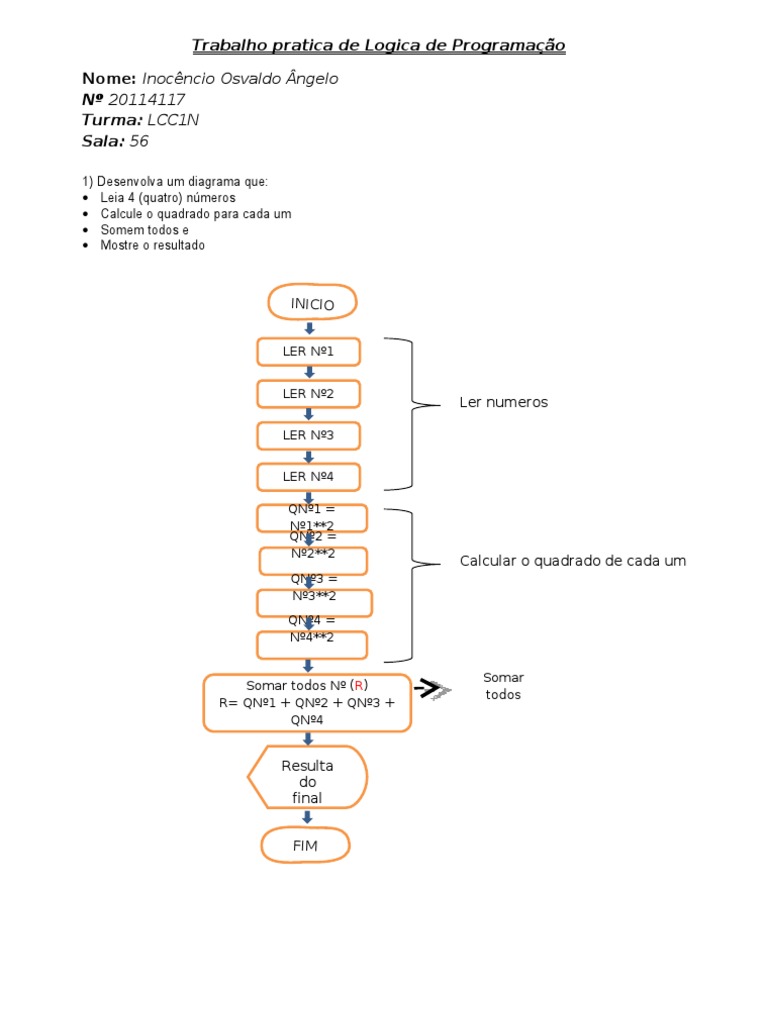 1) Desenvolva um diagrama que: Leia 4 (quatro) nmeros Calcule o quadrado para cada um Somem todos e Mostre o resultado