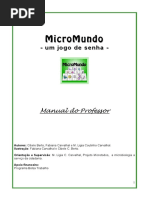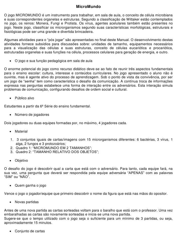 O jogo MICROMUNDO um instrumento para trabalhar, em sala de aula, o conceito de clula microbiana e suas correspondentes organelas e estruturas. Segundo a classificao de Wittaker esto contemplados no jogo, os reinos: Monera, Fungi e Protista. Os vrus, agentes acelulares tambm esto presentes no jogo. Neste jogo, classificar os microrganismos segundo suas caractersticas morfolgicas, estruturais e fisiolgicas pode ser uma grande e divertida brincadeira. Algumas atividades para o ps jogar so apresentadas no final deste Manual. O desenvolvimento destas atividades fornece subsdios para discusses sobre: unidades de tamanho, equipamentos necessrios para a visualizao das clulas e suas estruturas, conceito de clulas eucaritica e procaritica, estruturadas organelas e suas funes na clula, processos celulares para gerao de energia, e outro. O jogo e sua funo pedaggica em sala de aula