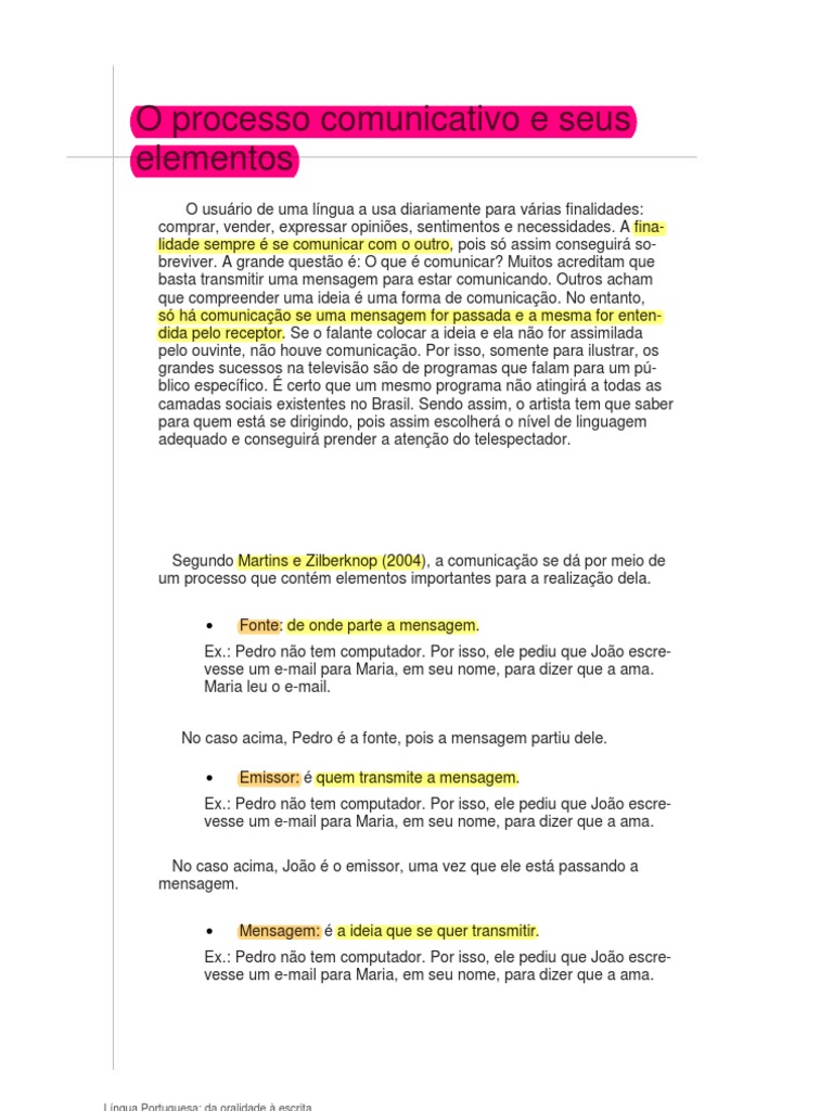 d) Maria viu Pedro saindo com Joana quando ela tinha combinado o contrrio. e) O pai de Pedro pediu ao menino para ele parar em casa e pegar os livros. 2. Identifique, nas situaes abaixo, os elementos do processo comunicativo. a) Pedro pediu para Joana falar para Maria esper-lo no final do corredor. b) Joo escreveu um e-mail para Maria dizendo que Pedro pedia que ela o esperasse no final do corredor. Maria leu o e-mail. c) Joo escreveu um e-mail para Maria dizendo que Pedro pedia que ela o esperasse no final do corredor. Joana leu o e-mail e falou para Maria.