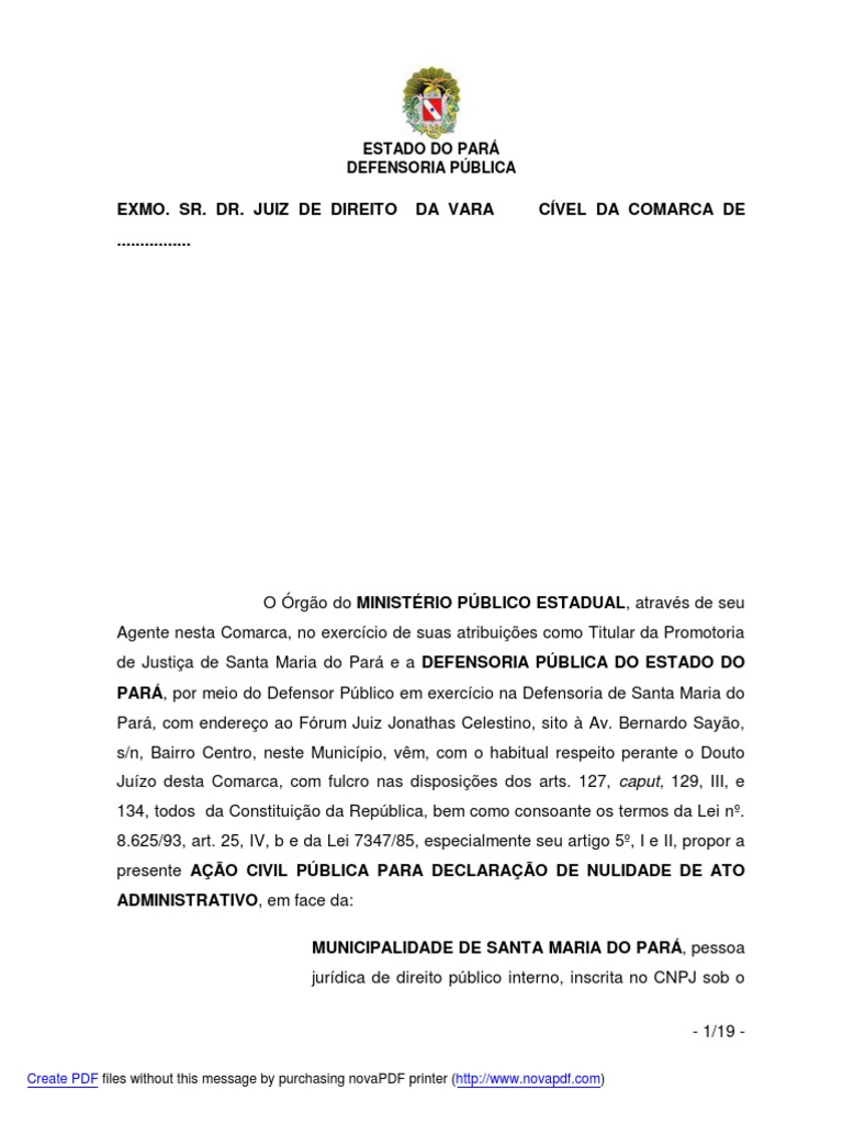 O rgo do MINISTRIO PBLICO ESTADUAL, atravs de seu Agente nesta Comarca, no exerccio de suas atribuies como Titular da Promotoria de Justia de Santa Maria do Par e a DEFENSORIA PBLICA DO ESTADO DO PAR, por meio do Defensor Pblico em exerccio na Defensoria de Santa Maria do Par, com endereo ao Frum Juiz Jonathas Celestino, sito Av. Bernardo Sayo, s/n, Bairro Centro, neste Municpio, vm, com o habitual respeito perante o Douto Juzo desta Comarca, com fulcro nas disposies dos arts. 127, caput, 129, III, e 134, todos da Constituio da Repblica, bem como consoante os termos da Lei n. 8.625/93, art. 25, IV, b e da Lei 7347/85, especialmente seu artigo 5, I e II, propor a presente AO CIVIL PBLICA PARA DECLARAO DE NULIDADE DE ATO ADMINISTRATIVO, em face da: MUNICIPALIDADE DE SANTA MARIA DO PAR, pessoa jurdica de direito pblico interno, inscrita no CNPJ sob o - 1/19 Create PDF files without this message by purchasing novaPDF printer ([Link]