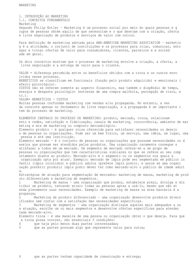 CONCEITOS FUNDAMENTAIS Marketing Segundo Philip Kotler Marketing um processo social por meio do quais pessoas e g rupos de pessoas obtm aquilo de que necessitam e o que desejam com a criao, oferta e livre negociao de produtos e servios de valor com outros. Para definio de marketing adotada pela AMA-AMERICAN MARKETING ASSOCIATION marketin g a atividade, o conjunto de instituies e os processos para criar, comunicar, entr egar e trocar ofertas de valor para consumidores, clientes, parceiros e a socied ade em geral. Os dois conceitos mostram que o processo de marketing envolve a criao, a oferta, a livre negociao e a entrega de valor para o cliente. VALOR = diferena percebida entre os benefcios obtidos com a troca e os custos envo lvidos nesse processo. BENEFCIOS se classificam em funcionais (funo pelo produto adquirido) e emocionais ( efeito psicolgico). CUSTOS no se referem somente ao aspecto financeiro, mas tambm o dispndio de tempo, energia e desgaste psicolgico (estresse de uma compra malfeita, percepo de risco, e tc.). VALOR= BENEFCIOS CUSTOS Muitas pessoas confundem marketing com vendas e/ou propaganda. No entanto, a ven da consiste apenas no fechamento da livre negociao, e a propaganda um importante i tem do processo de marketing. ELEMENTOS CENTRAIS DO PROCESSO DE MARKETING: produto, mercado, troca, relacionam ento e redes, satisfao e fidelizao, canais de marketing, concorrncia, ambiente de mar keting e mix de marketing ou composto mercadolgico. Elemento produto qualquer coisa oferecida para satisfazer necessidades ou desejo s de pessoas ou organizaes. Pode ser um bem fsico, um servio, uma idia, um lugar, uma pessoa e at uma instituio. Elemento mercado o conjunto de pessoas ou organizaes que possuem necessidades ou d esejos que possam ser atendidos pelos produtos. Uma organizao raramente consegue s atisfazer a todos em um mercado. Um segmento de mercado refere-se a um grupo de pessoas ou organizaes que tem caractersticas similares no que se refere ao seu comp ortamento diante ao produto. Mercado-alvo o segmento ou os segmentos nos quais a organizao opta por atuar. Exemplo: mercado de lpis pode ser segmentado em pblico in fantil (lpis coloridos) e pblico adulta (prefere lpis preto), e assim se uma organi zao preferir produzir lpis preto dever ter como mercado-alvo o pblico de idade adult a. Estratgias de atuao para segmentao de mercados: marketing de massa, marketing de prod uto diferenciado e marketing de segmentos. 1 Marketing de massa uma organizao que produz, estabelece preo, divulga e dis tribui um produto, tentando atrair todas as pessoas aptas a us-lo, mesmo que no at enda plenamente suas necessidades. Exemplo de marketing de massa na rea bancria a poupana; 2 Marketing de produto diferenciado uma organizao desenvolve produtos divers ificados sem contar com a satisfao das necessidades especficas. 3 Marketing de segmentos uma organizao distingue aqueles mais adequados a su a atuao, escolhe um ou mais segmentos e desenvolve ofertas especficas para atender cada mercado-alvo. Elemento troca uma maneira de uma pessoa ou organizao obter o que deseja. Para que a troca possa ocorrer, so essenciais 5 condies: 4 que haja pelo menos duas partes interessadas; 5 que as partes possuam algo que represente valor para outra;