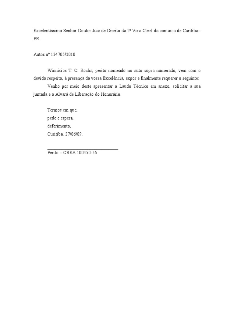 Rocha, perito nomeado no auto supra numerado, vem com o devido respeito, presena da vossa Excelncia, expor e finalmente requerer o seguinte: Venho por meio deste apresentar o Laudo Tcnico em anexo, solicitar a sua juntada e o Alvar de Liberao do Honorrio. Termos em que, pede e espera, deferimento, Curitiba, 27/06/09. ______________________________ Perito CREA 100450-56