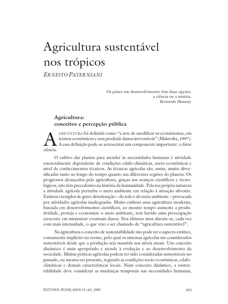A Agricultura sustentvel deve envolver o manejo eficiente dos recursos disponveis para satisfazer s crescentes aspiraes de uma tambm crescente populao, mantendo ou melhorando a qualidade do ambiente e conservando os recursos naturais. Tendo surgido h dez mil anos, a agricultura passou por vrias fases, atingindo no presente uma eficincia sem precedentes graas ao emprego racional dos avanos cientficos. A agricultura tropical enfrenta mais problemas, que so tambm mais complexos do que aqueles que ocorrem nos climas temperados. Apesar das limitaes, o Brasil tem a agricultura tropical mais desenvolvida. Progressos subseqentes so esperados com o emprego de tcnicas inovadoras, como a Biotecnologia.