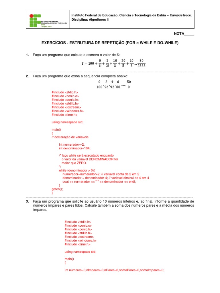EXERCCIOS - ESTRUTURA DE REPETIO (FOR e WHILE E DO-WHILE)