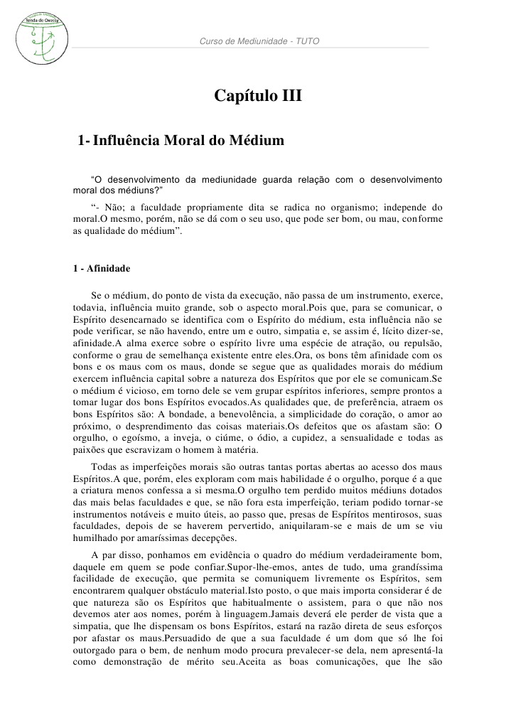 mdium possuir da questo medinica, melhor possibilidade ter de atender, equilibradamente, a sua tarefa de medianeiro entre os dois planos da vida.