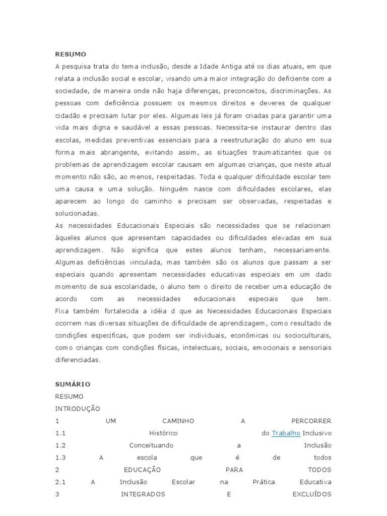 SUMRIO RESUMO INTRODUO 1 1.1 1.2 1.3 2 2.1 3 A A UM CAMINHO Histrico Conceituando escola EDUCAO Incluso INTEGRADOS Escolar que a PARA na E Prtica de A PERCORRER do Trabalho Inclusivo Incluso todos TODOS Educativa EXCLUDOS