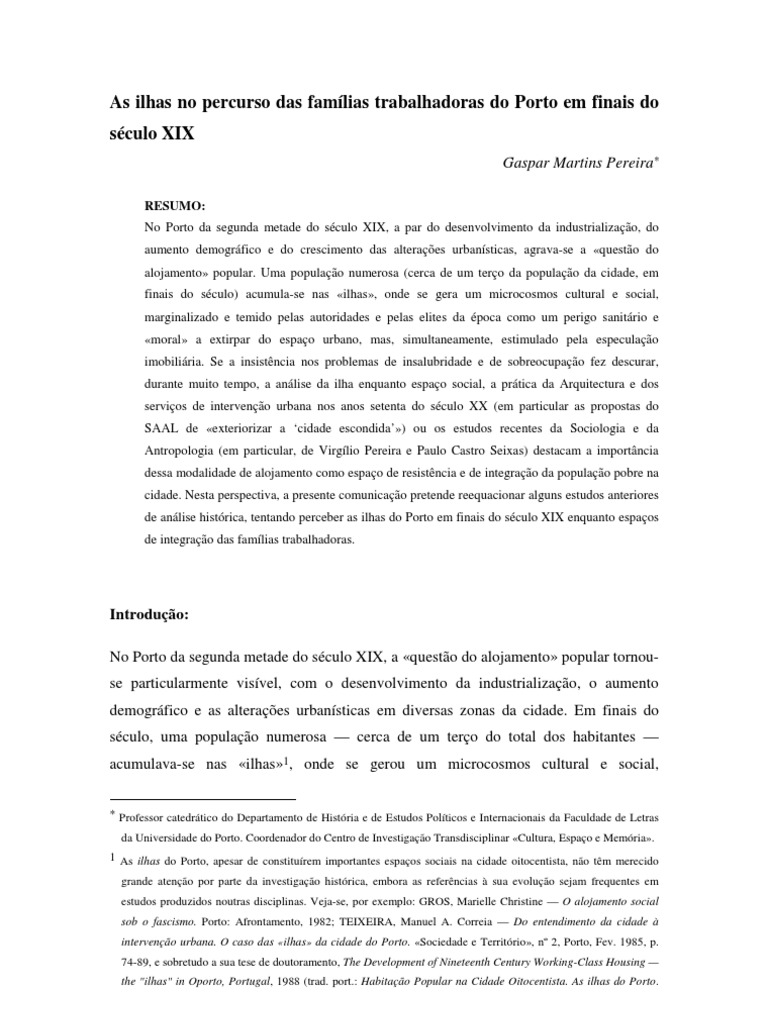 * Professor catedrático do Departamento de História e de Estudos Políticos e Internacionais da Faculdade de Letras da Universidade do Porto. Coordenador do Centro de Investigação Transdisciplinar «Cultura, Espaço e Memória». 1 As ilhas do Porto, apesar de constituírem importantes espaços sociais na cidade oitocentista, não têm merecido grande atenção por parte da investigação histórica, embora as referências à sua evolução sejam frequentes em estudos produzidos noutras disciplinas. Veja-se, por exemplo: GROS, Marielle Christine — O alojamento social sob o fascismo. Porto: Afrontamento, 1982; TEIXEIRA, Manuel A. Correia — Do entendimento da cidade à intervenção urbana. O caso das «ilhas» da cidade do Porto. «Sociedade e Território», nº 2, Porto, Fev. 1985, p. 74-89, e sobretudo a sua tese de doutoramento, The Development of Nineteenth Century Working-Class Housing — the "ilhas" in Oporto, Portugal, 1988 (trad. port.: Habitação Popular na Cidade Oitocentista. As ilhas do Porto.