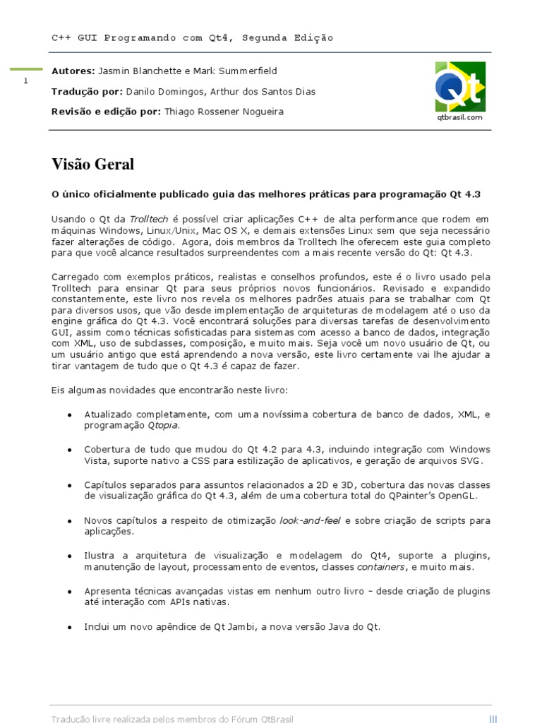 O nico oficialmente publicado guia das melhores prticas para programao Qt 4.3 Usando o Qt da Trolltech possvel criar aplicaes C++ de alta performance que rodem em mquinas Windows, Linux/Unix, Mac OS X, e demais extenses Linux sem que seja necessrio fazer alteraes de cdigo. Agora, dois membros da Trolltech lhe oferecem este guia completo para que voc alcance resultados surpreendentes com a mais recente verso do Qt: Qt 4.3. Carregado com exemplos prticos, realistas e conselhos profundos, este o livro usado pela Trolltech para ensinar Qt para seus prprios novos funcionrios. Revisado e expandido constantemente, este livro nos revela os melhores padres atuais para se trabalhar com Qt para diversos usos, que vo desde implementao de arquiteturas de modelagem at o uso da engine grfica do Qt 4.3. Voc encontrar solues para diversas tarefas de desenvolvimento GUI, assim como tcnicas sofisticadas para sistemas com acesso a banco de dados, integrao com XML, uso de subclasses, composio, e muito mais. Seja voc um novo usurio de Qt, ou um usurio antigo que est aprendendo a nova verso, este livro certamente vai lhe ajudar a tirar vantagem de tudo que o Qt 4.3 capaz de fazer. Eis algumas novidades que encontraro neste livro: Atualizado completamente, com uma novssima cobertura de banco de dados, XML, e programao Qtopia. Cobertura de tudo que mudou do Qt 4.2 para 4.3, incluindo integrao com Windows Vista, suporte nativo a CSS para estilizao de aplicativos, e gerao de arquivos SVG. Captulos separados para assuntos relacionados a 2D e 3D, cobertura das novas classes de visualizao grfica do Qt 4.3, alm de uma cobertura total do QPainters OpenGL. Novos captulos a respeito de otimizao look-and-feel e sobre criao de scripts para aplicaes. Ilustra a arquitetura de visualizao e modelagem do Qt4, suporte a plugins, manuteno de layout, processamento de eventos, classes containers, e muito mais. Apresenta tcnicas avanadas vistas em nenhum outro livro - desde criao de plugins at interao com APIs nativas. Inclui um novo apndice de Qt Jambi, a nova verso Java do Qt.