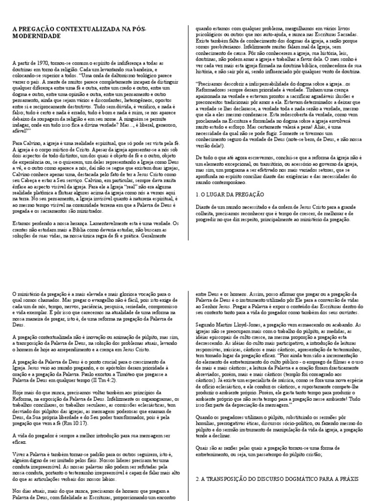 O ministrio da pregao a mais elevada e mais gloriosa vocao para o qual somos chamados. Mas pregar o evangelho no fcil, pois isto exige de cada um de ns, tempo, nervos, pacincia, pesquisa, seriedade, compromisso e vida exemplar. pr isso que carecemos na atualidade de uma reforma na nossa maneira de pregar, isto , de uma reforma na pregao da Palavra de Deus. A pregao contextualizada no inovao ou animao de plpito, mas sim, a transposio da Palavra de Deus, na soluo dos problemas atuais, levando o homem de hoje ao arrependimento e a crena em Jesus Cristo. A pregao da Palavra de Deus o ponto crucial para o crescimento da Igreja. Jesus veio ao mundo pregando, e os apstolos deram prioridade orao e a pregao da Palavra. Paulo exortou a Timteo que pregasse a Palavra de Deus em qualquer tempo (II Tm 4:2). Hoje mais do que nunca, precisamos voltar tambm aos princpios da Reforma, na exposio da Palavra de Deus. Infelizmente os organogramas, os trabalhos conciliares, os trabalhos seculares, as comisses eclesisticas, tem desviado dos plpitos das igrejas, as mensagens poderosas que enaman de Deus, da Sua prpria liberdade e do Seu poder transformador, pois pela pregao que vem a f (Rm 10:17). A vida do pregador sempre a melhor introduo para sua mensagem ser eficaz. Viver a Palavra tambm tornar-se padro para os outros seguirem, isto , algum digno de ser imitado pelos fiis. Nossos lderes precisam ter uma conduta irrepreensvel. As nossas palavras no podem ser refutadas pela nossa conduta, portanto o testemunho irrepreensvel capaz de falar mais alto do que as articulaes verbais dos nossos lbios. Nos dias atuais, mais do que nunca, precisamos de homens que pregam a Palavra de Deus, com fidelidade as Escrituras, proporcionando um encontro