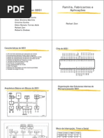 denunciar EEL7030 A famlia de microcontroladores 8051 1 Comentrios sobre microcontroladores Um microcontrolador um componente que tem, num nico chip, alm de uma CPU, elementos tais como memrias ROM e RAM, temporizadores/contadores, PWM, conversor AD, canais de comunicao e conversores analgico-digitais. Esta caracterstica diferencia os sistemas baseados em microcontroladores daqueles baseados em microprocessadores, onde normalmente se utilizam vrios componentes para implementar essas funes. Com isso, os microcontroladores permitem a implementao de sistemas mais compactos e baratos do que aqueles baseados em microprocessadores. Em contrapartida, as CPUs dos microcontroladores so, menos poderosas do que os microprocessadores. Seu conjunto de instrues costuma se limitar s instrues mais simples, sua freqncia de clock mais baixa e o espao de memria enderevel costuma ser bem menor. V-se da que o campo de aplicao dos microcontroladores diferente daquele dos microprocessadores, e que um sistema que possa ser controlado por um microcontrolador tende a ter menor complexidade e menor custo do que um sistema que exija a capacidade de processamento de um microprocessador. Exemplos de sistemas onde os microcontroladores encontram aplicao incluem controle de semforos, balanas eletrnicas, microterminais, telefones pblicos, controle de carregadores de baterias, inversores eletrnicos, controles de acesso, taxmetros, sistemas de aquisio de dados de manufatura e eletrodomsticos em geral. A programao dos microcontroladores mais simples do que a dos microprocessadores. Isto acontece porque os perifricos on-chip dos microcontroladores so acessados de uma forma padronizada e integrada na prpria linguagem de programao, dispensando o conhecimento de detalhes externos. No se deve pensar, porm, que isto simplifique a tarefa do programador em todos os nveis: necessrio que ele conhea bem o hardware conectado ao microcontrolador para poder produzir programas que funcionem corretamente.
