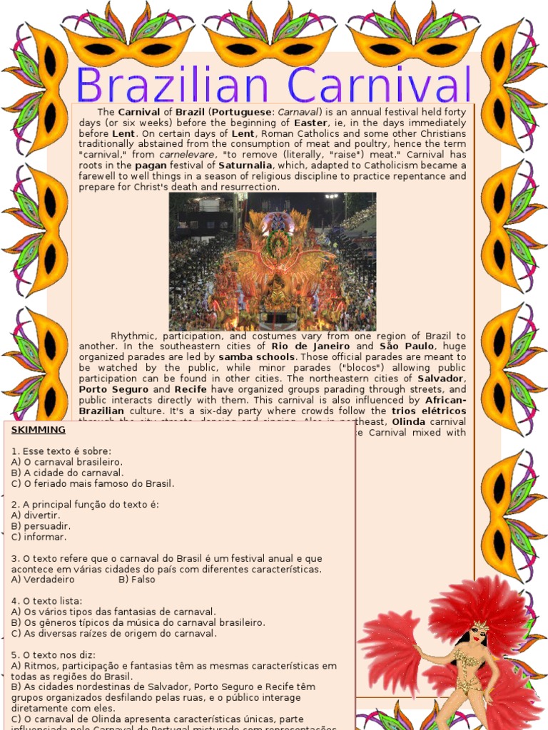 Rhythmic, participation, and costumes vary from one region of Brazil to another. In the southeastern cities of Rio de Janeiro and So Paulo, huge organized parades are led by samba schools. Those official parades are meant to be watched by the public, while minor parades ("blocos") allowing public participation can be found in other cities. The northeastern cities of Salvador, Porto Seguro and Recife have organized groups parading through streets, and public interacts directly with them. This carnival is also influenced by AfricanBrazilian culture. It's a six-day party where crowds follow the trios eltricos through the city streets, dancing and singing. Also in northeast, Olinda carnival SKIMMING features unique characteristics, part influenced by Venice Carnival mixed with cultural depictions of local folklore. 1. Esse texto sobre: A) O carnaval brasileiro. B) A cidade do carnaval. C) O feriado mais famoso do Brasil. 2. A principal funo do texto : A) divertir. B) persuadir. C) informar. 3. O texto refere que o carnaval do Brasil um festival anual e que acontece em vrias cidades do pas com diferentes caractersticas. A) Verdadeiro B) Falso 4. O texto lista: A) Os vrios tipos das fantasias de carnaval. B) Os gneros tpicos da msica do carnaval brasileiro. C) As diversas razes de origem do carnaval. 5. O texto nos diz: A) Ritmos, participao e fantasias tm as mesmas caractersticas em todas as regies do Brasil. B) As cidades nordestinas de Salvador, Porto Seguro e Recife tm grupos organizados desfilando pelas ruas, e o pblico interage diretamente com eles. C) O carnaval de Olinda apresenta caractersticas nicas, parte influenciada pelo Carnaval de Portugal misturado com representaes culturais do folclore local. 6. A informao neste texto est atualizada.