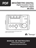 3. ESPECIFICAES 3.1. Gerais a. Visor: Cristal lquido (LCD) mltiplo, 4.000 contagens (3999). b. Funes: Tenso contnua e alternada, corrente contnua e alternada, resistncia, capacitncia, temperatura, freqncia, teste de continuidade e diodos, umidade relativa, intensidade luminosa (Lux), intensidade sonora (dB), ciclo de atividade, desligamento automtico (Auto Power Off) e aviso de conexo errada (Beep Guard). c. Polaridade: Automtica. d. Seleo de escalas: Manual e automtica. e. Indicao de sobrecarga: O Visor exibe as letras O.L. f. Indicao de bateria descarregada: O visor exibe o smbolo de uma bateria quando restar apenas 10% da energia til. g. Temperatura e umidade de operao: De 0C a 40C / menor que 75% sem condensao. h. Alimentao: Trs pilhas de 1,5 V tipo 'AAA'. i. Taxa de amostragem do sinal: 2,5 vezes por segundo. j. Proteo: 0,5A/250V e Fusvel de vidro de ao rpida 10A/250V. k. Dimenses: 195x92x55mm. l. Peso: 400g (incluindo as pilhas). m. O MD-6290 vem acompanhado de um manual de instrues, um par de pontas de prova (uma preta e outra vermelha), um termopar tipo K e uma caixa de embalagem. =3=