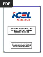 c. Remova as pontas de prova do circuito que est testando quando for mudar a posio da chave seletora. d. Nunca ultrapasse os limites de tenso ou corrente de cada escala, pois poder danificar seriamente o multmetro. e. Nunca se deve medir resistncia em um circuito que esteja energizado, ou antes, que os capacitores do mesmo estejam descarregados. f. Quando no for usar o MD-6290 por um perodo prolongado, remova as pilhas e guarde-as em separado do aparelho. g. Antes de usar o multmetro, examine-o juntamente com as pontas de prova, para ver se apresentam alguma anormalidade ou dano. Em caso afirmativo, desligue-o imediatamente e o encaminhe para uma assistncia tcnica autorizada pela ICEL. h. Em caso de dvida nas medies de tenso e corrente selecione sempre a escala mais alta da funo que voc ir usar. Nunca faa uma medio se esta puder superar o valor da escala selecionada. i. Sempre preste muita ateno ao conectar as pontas de prova, pois apesar da funo Beep Guard, uma conexo errada pode provocar a queima do multmetro e do equipamento sob teste. j. No coloque o MD-6290 prximo a fontes de calor, pois poder deformar o seu gabinete. k. Quando estiver trabalhando com eletricidade, nunca fique em contato direto com o solo ou estruturas que estejam aterradas, pois em caso de acidente poder levar um choque eltrico. Utilize de preferncia calados com sola de borracha. l. Lembre-se de pensar e agir em segurana.