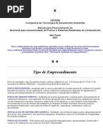 Dentre as linhas, tem-se as metlicas galvanizadas convencionais e as de PEAD. As primeiras so mais sujeitas a fragilizao por esforo mecnico, em razo de suas caractersticas e rigidez dos metais de que so construdas. As de PEAD, fabricadas atualmente, apresentam permeabilidade similar dos metais e possuem grande resistncia mecnica, contudo so flexveis para absorver os impactos e adaptar-se movimentao do piso e do solo. Tambm so utilizadas tubulaes secundrias, as quais envolve a tubulao principal, para uma eficincia da conteno de vazamentos, inclusive com a instalao de sensores de vazamentos, no espao entre as duas tubulaes. Tm-se, ainda, os respiros, que so linhas, em parte subterrneas e em parte areas, individuais de cada tanque de armazenamento e, quase sempre, esto localizadas acima da cobertura do estabelecimento ou junto s paredes ou aos muros de divisa, e so pontos tambm sujeitos a extravasamentos de combustveis durante as operaes de descarga do produto, quando do excessivo enchimento dos tanques. Como a manuteno das linhas dos respiros, nem sempre to rigorosa quanto nas demais linhas do sistema de armazenamento do estabelecimento, podem ocorrer perdas do produto por furos ou pelas suas conexes, sendo que os eventuais vazamentos podem ser visualmente detectados pela impregnao, com o produto, das tubulaes ou da coluna da cobertura do estabelecimento. 3.7.3 - Cmaras de Contato Nas unidades de abastecimento, tambm denominadas de bombas de abastecimento, so freqentes os vazamentos de combustveis a partir das conexes que integram o sistema de bombeamento e abastecimento dos produtos. Esses vazamentos, ainda que em pequenas propores, normalmente geram grandes contaminaes do subsolo, por longos perodos de tempo, motivo pelo qual recomenda-se a utilizao das cmaras de conteno, confeccionadas em material impermevel, sob as unidades de abastecimento, as quais impedem o contato direto do produto vazado com o solo e indicam qualquer vazamento, atravs de sensores instalados em seu interior. O mesmo ocorre no sistema de descarga de combustveis, onde, em sua grande maioria, as cmaras de calada de acesso s bocas de descarga de combustveis dos tanques subterrneos no so impermeabilizadas, razo pela qual os costumeiros extravasamentos ocorridos durante o descarregamento dos produtos acabam por contaminar o subsolo, sendo comum observar-se presena de combustvel acumulado nas bocas de descarga ou a presena de solo impregnado com o produto ao redor das mesmas. As cmaras de calada com conteno de descarga de combustveis so dispositivos confeccionados em material impermevel, que permitem a total reteno de eventuais vazamentos, evitando que o produto atinja o solo. O sistema de conteno pode ser complementado pela instalao de um dispositivo de descarga selada no bocal de enchimento do tanque para evitar o retorno do combustvel em caso de ser excedida a capacidade do tanque, bem como pela instalao de uma vlvula contra transbordamentos na linha de descarga interna ao tanque.