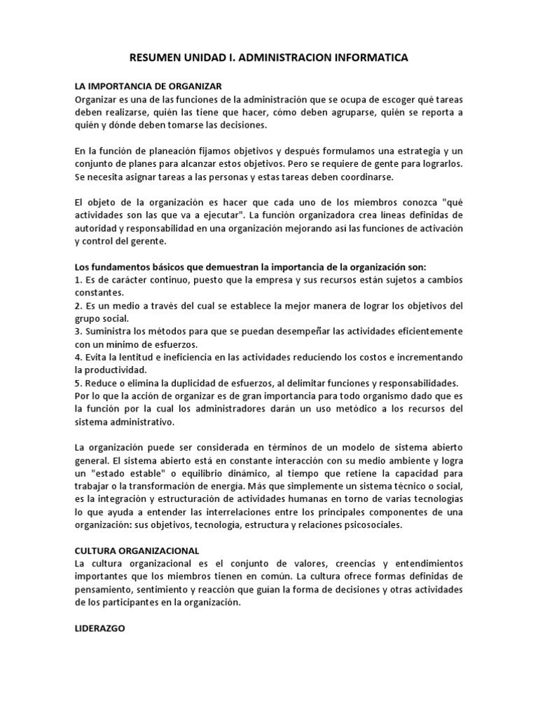 LA IMPORTANCIA DE ORGANIZAR Organizar es una de las funciones de la administración que se ocupa de escoger qué tareas deben realizarse, quién las tiene que hacer, cómo deben agruparse, quién se reporta a quién y dónde deben tomarse las decisiones. En la función de planeación fijamos objetivos y después formulamos una estrategia y un conjunto de planes para alcanzar estos objetivos. Pero se requiere de gente para lograrlos. Se necesita asignar tareas a las personas y estas tareas deben coordinarse. El objeto de la organización es hacer que cada uno de los miembros conozca "qué actividades son las que va a ejecutar". La función organizadora crea líneas definidas de autoridad y responsabilidad en una organización mejorando así las funciones de activación y control del gerente. Los fundamentos básicos que demuestran la importancia de la organización son: 1. Es de carácter continuo, puesto que la empresa y sus recursos están sujetos a cambios constantes. 2. Es un medio a través del cual se establece la mejor manera de lograr los objetivos del grupo social. 3. Suministra los métodos para que se puedan desempeñar las actividades eficientemente con un mínimo de esfuerzos. 4. Evita la lentitud e ineficiencia en las actividades reduciendo los costos e incrementando la productividad. 5. Reduce o elimina la duplicidad de esfuerzos, al delimitar funciones y responsabilidades. Por lo que la acción de organizar es de gran importancia para todo organismo dado que es la función por la cual los administradores darán un uso metódico a los recursos del sistema administrativo. La organización puede ser considerada en términos de un modelo de sistema abierto general. El sistema abierto está en constante interacción con su medio ambiente y logra un "estado estable" o equilibrio dinámico, al tiempo que retiene la capacidad para trabajar o la transformación de energía. Más que simplemente un sistema técnico o social, es la integración y estructuración de actividades humanas en torno de varias tecnologías lo que ayuda a entender las interrelaciones entre los principales componentes de una organización: sus objetivos, tecnología, estructura y relaciones psicosociales. CULTURA ORGANIZACIONAL La cultura organizacional es el conjunto de valores, creencias y entendimientos importantes que los miembros tienen en común. La cultura ofrece formas definidas de pensamiento, sentimiento y reacción que guían la forma de decisiones y otras actividades de los participantes en la organización. LIDERAZGO