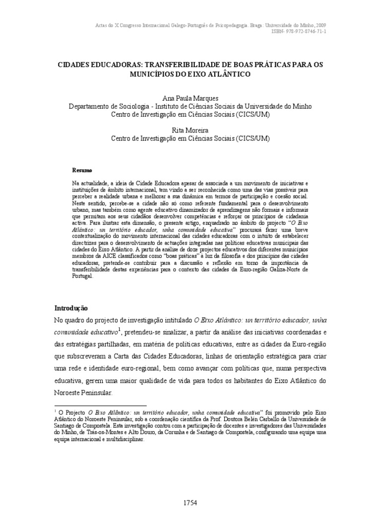 1 O Projecto O Eixo Atlântico: un território educador, unha comunidade educativa”foipromovidopeloEixo Atlântico do Noroeste Peninsular, sob a coordenação científica da Prof. Doutora Belén Carballo da Universidade de Santiago de Compostela. Esta investigação contou com a participação de docentes e investigadores das Universidades do Minho, de Trás-os-Montes e Alto Douro, da Corunha e de Santiago de Compostela, configurando uma equipa uma equipa internacional e multidisciplinar.
