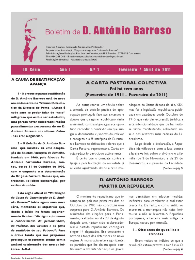 1 - O processo para a beaticao de D. Antnio Barroso est de novo em andamento no Tribunal Eclesistico da Diocese do Porto. Ainda cedo para se poder falar do caso milagroso que est a ser estudado, mas parece haver redobradas razes para alimentar a esperana de ver D. Antnio Barroso nos altares. Cabe-nos orar e aguardar. 2 - O Boletim de D. Antnio Barroso que resultou de uma adaptao do Boletim Paroquial de Remelhe, fundado em 1966, pelo falecido Pe. Antnio Fernandes Cardoso, contou, desde 31 de Outubro de 1992, com o empenho e a determinao do Dr. Jos Ferreira Gomes que, entretanto, solicitou exonerao, por razes de sade. Este rgo ocial da Postulao da Causa da Canonizao de D. Antnio Barroso inicia agora uma nova srie, mantendo os objectivos que, desde o incio lhe foram superiormente xados: divulgar e promover o conhecimento da personalidade, da vivncia, das virtudes e da fama de santidade do seu Patrono. Para a rdua tarefa que nos propomos prosseguir, esperamos contar com a amvel colaborao dos nossos leitores. A.G.A.