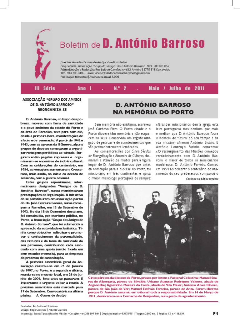 Director: Amadeu Gomes de Arajo, Vice-Postulador Propriedade: Associao "Grupo dos Amigos de D. Antnio Barroso". NIPC 508 401 852 Administrao e Redaco: Rua Lus de Cames, n. 632, Arneiro | 2775-518 Carcavelos Tlm.: 934 285 048 E-mail: vicepostulador.antoniobarroso@gmail.com Publicao trimestral | Assinatura anual: 5,00