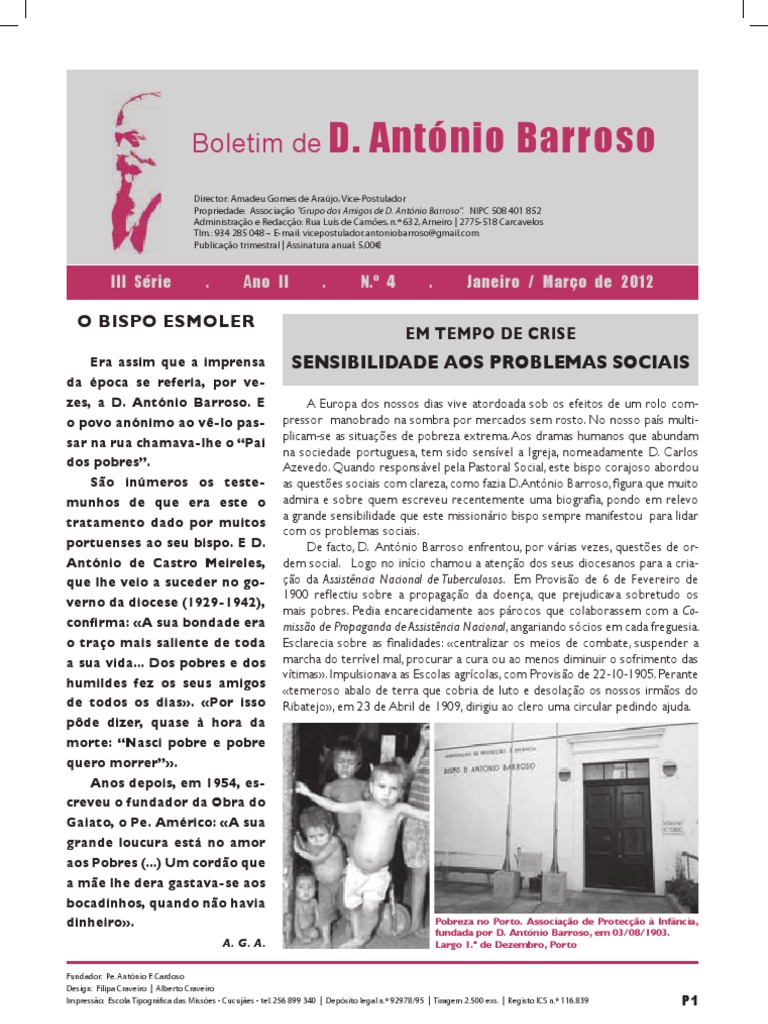 Director: Amadeu Gomes de Arajo, Vice-Postulador Propriedade: Associao "Grupo dos Amigos de D. Antnio Barroso". NIPC 508 401 852 Administrao e Redaco: Rua Lus de Cames, n. 632, Arneiro | 2775-518 Carcavelos Tlm.: 934 285 048 E-mail: vicepostulador.antoniobarroso@gmail.com Publicao trimestral | Assinatura anual: 5,00
