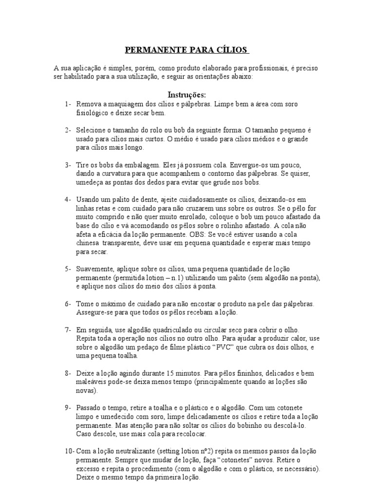1- Remova a maquiagem dos clios e plpebras. Limpe bem a rea com soro fisiolgico e deixe secar bem. 2- Selecione o tamanho do rolo ou bob da seguinte forma: O tamanho pequeno usado para clios mais curtos. O mdio usado para clios mdios e o grande para clios mais longo. 3- Tire os bobs da embalagem. Eles j possuem cola. Envergue-os um pouco, dando a curvatura para que acompanhem o contorno das plpebras. Se quiser, umedea as pontas dos dedos para evitar que grude nos bobs. 4- Usando um palito de dente, ajeite cuidadosamente os clios, deixando-os em linhas retas e com cuidado para no cruzarem uns sobre os outros. Se o plo for muito comprido e no quer muito enrolado, coloque o bob um pouco afastado da base do clio e v acomodando os plos sobre o rolinho afastado. A cola no afeta a eficcia da loo permanente. OBS: Se voc estiver usando a cola chinesa transparente, deve usar em pequena quantidade e esperar mais tempo para secar. 5- Suavemente, aplique sobre os clios, uma pequena quantidade de loo permanente (permitida lotion n.1) utilizando um palito (sem algodo na ponta), e aplique nos clios do meio dos clios ponta. 6- Tome o mximo de cuidado para no encostar o produto na pele das plpebras. Assegure-se para que todos os plos recebam a loo. 7- Em seguida, use algodo quadriculado ou circular seco para cobrir o olho. Repita toda a operao nos clios no outro olho. Para ajudar a produzir calor, use sobre o algodo um pedao de filme plstico PVC que cubra os dois olhos, e uma pequena toalha. 8- Deixe a loo agindo durante 15 minutos. Para plos fininhos, delicados e bem maleveis pode-se deixa menos tempo (principalmente quando as loes so novas). 9- Passado o tempo, retire a toalha e o plstico e o algodo. Com um cotonete limpo e umedecido com soro, limpe delicadamente os clios e retire toda a loo permanente. Mas ateno para no soltar os clios do bobinho ou descol-lo. Caso descole, use mais cola para recolocar. 10- Com a loo neutralizante (setting lotion n2) repita os mesmos passos da loo permanente. Sempre que mudar de loo, faa cotonetes novos. Retire o excesso e repita o procedimento (com o algodo e com o plstico, se necessrio). Deixe o mesmo tempo da primeira loo.