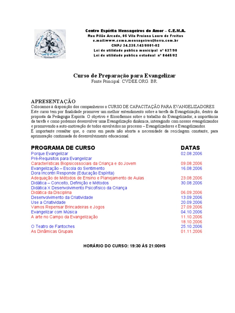 Rua Pilo Arcado, 05 Vila Praiana Lauro de Freitas e.mail:www.cema.mensageiros@terra.com.br CNPJ 34.235.143/0001-02 Lei de utilidade publica municipal n 637/90 Lei de utilidade publica estadual n 8445/02
