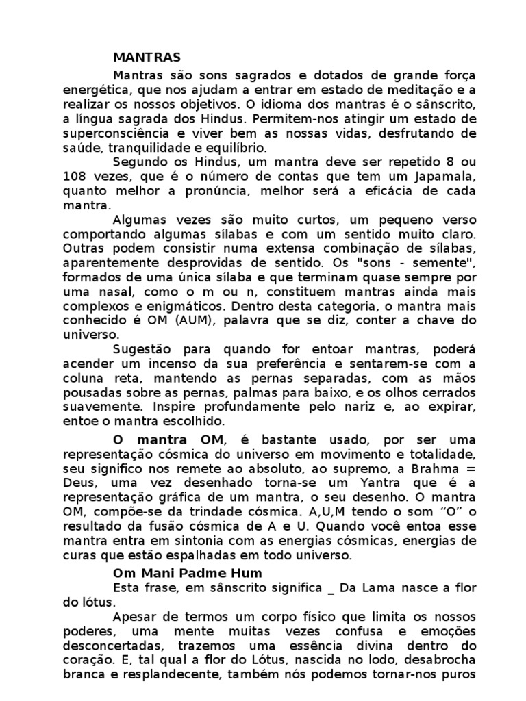 os nossos objetivos. O idioma dos mantras o snscrito, a lngua sagrada dos Hindus. Permitem-nos atingir um estado de superconscincia e viver bem as nossas vidas, desfrutando de sade, tranquilidade e equilbrio. Segundo os Hindus, um mantra deve ser repetido 8 ou 108 vezes, que o nmero de contas que tem um Japamala, quanto melhor a pronncia, melhor ser a eficcia de cada mantra. Algumas vezes so muito curtos, um pequeno verso comportando algumas slabas e com um sentido muito claro. Outras podem consistir numa extensa combinao de slabas, aparentemente desprovidas de sentido. Os "sons - semente", formados de uma nica slaba e que terminam quase sempre por uma nasal, como o m ou n, constituem mantras ainda mais complexos e enigmticos. Dentro desta categoria, o mantra mais conhecido OM (AUM), palavra que se diz, conter a chave do universo. Sugesto para quando for entoar mantras, poder acender um incenso da sua preferncia e sentarem-se com a coluna reta, mantendo as pernas separadas, com as mos pousadas sobre as pernas, palmas para baixo, e os olhos cerrados suavemente. Inspire profundamente pelo nariz e, ao expirar, entoe o mantra escolhido. O mantra OM, bastante usado, por ser uma representao csmica do universo em movimento e totalidade, seu significo nos remete ao absoluto, ao supremo, a Brahma = Deus, uma vez desenhado torna-se um Yantra que a representao grfica de um mantra, o seu desenho. O mantra OM, compe-se da trindade csmica. A,U,M tendo o som O o resultado da fuso csmica de A e U. Quando voc entoa esse mantra entra em sintonia com as energias csmicas, energias de curas que esto espalhadas em todo universo. Om Mani Padme Hum Esta frase, em snscrito significa _ Da Lama nasce a flor do ltus. Apesar de termos um corpo fsico que limita os nossos poderes, uma mente muitas vezes confusa e emoes desconcertadas, trazemos uma essncia divina dentro do corao. E, tal qual a flor do Ltus, nascida no lodo, desabrocha branca e resplandecente, tambm ns podemos tornar-nos puros