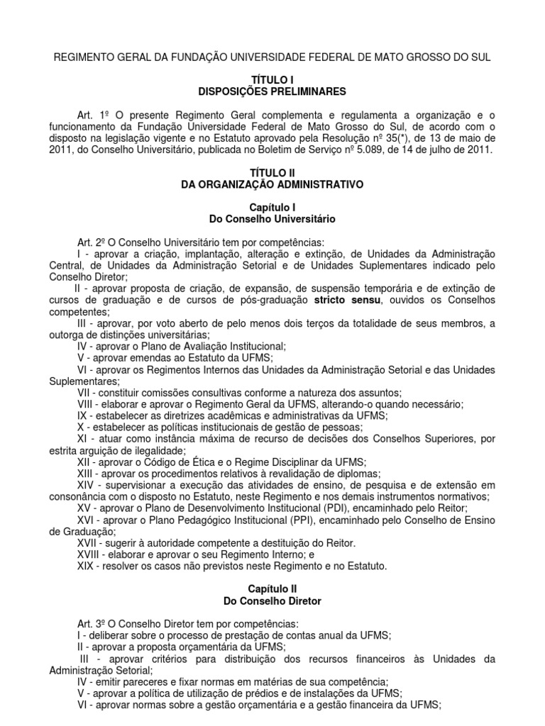 1 O presente Regimento Geral complementa e regulamenta a organizao e o funcionamento da Fundao Universidade Federal de Mato Grosso do Sul, de acordo com o disposto na legislao vigente e no Estatuto aprovado pela Resoluo n 35(*), de 13 de maio de 2011, do Conselho Universitrio, publicada no Boletim de Servio n 5.089, de 14 de julho de 2011. TTULO II DA ORGANIZAO ADMINISTRATIVO Captulo I Do Conselho Universitrio Art. 2 O Conselho Universitrio tem por competncias: I - aprovar a criao, implantao, alterao e extino, de Unidades da Administrao Central, de Unidades da Administrao Setorial e de Unidades Suplementares indicado pelo Conselho Diretor; II - aprovar proposta de criao, de expanso, de suspenso temporria e de extino de cursos de graduao e de cursos de ps-graduao stricto sensu, ouvidos os Conselhos competentes; III - aprovar, por voto aberto de pelo menos dois teros da totalidade de seus membros, a outorga de distines universitrias; IV - aprovar o Plano de Avaliao Institucional; V - aprovar emendas ao Estatuto da UFMS; VI - aprovar os Regimentos Internos das Unidades da Administrao Setorial e das Unidades Suplementares; VII - constituir comisses consultivas conforme a natureza dos assuntos; VIII - elaborar e aprovar o Regimento Geral da UFMS, alterando-o quando necessrio; IX - estabelecer as diretrizes acadmicas e administrativas da UFMS; X - estabelecer as polticas institucionais de gesto de pessoas; XI - atuar como instncia mxima de recurso de decises dos Conselhos Superiores, por estrita arguio de ilegalidade; XII - aprovar o Cdigo de tica e o Regime Disciplinar da UFMS; XIII - aprovar os procedimentos relativos revalidao de diplomas; XIV - supervisionar a execuo das atividades de ensino, de pesquisa e de extenso em consonncia com o disposto no Estatuto, neste Regimento e nos demais instrumentos normativos; XV - aprovar o Plano de Desenvolvimento Institucional (PDI), encaminhado pelo Reitor; XVI - aprovar o Plano Pedaggico Institucional (PPI), encaminhado pelo Conselho de Ensino de Graduao; XVII - sugerir autoridade competente a destituio do Reitor. XVIII - elaborar e aprovar o seu Regimento Interno; e XIX - resolver os casos no previstos neste Regimento e no Estatuto. Captulo II Do Conselho Diretor Art. 3 O Conselho Diretor tem por competncias: I - deliberar sobre o processo de prestao de contas anual da UFMS; II - aprovar a proposta oramentria da UFMS; III - aprovar critrios para distribuio dos recursos financeiros s Unidades da Administrao Setorial; IV - emitir pareceres e fixar normas em matrias de sua competncia; V - aprovar a poltica de utilizao de prdios e de instalaes da UFMS; VI - aprovar normas sobre a gesto oramentria e a gesto financeira da UFMS;