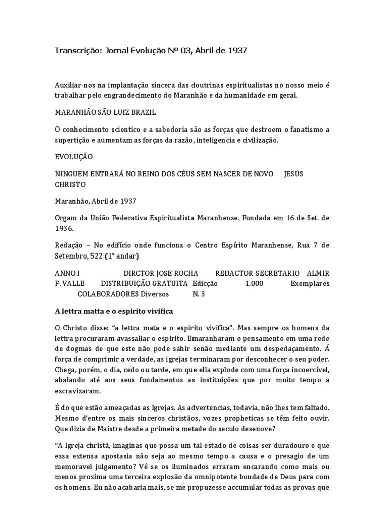 Auxiliar-nos na implantao sincera das doutrinas espiritualistas no nosso meio trabalhar pelo engrandecimento do Maranho e da humanidade em geral. MARANHO SO LUIZ BRAZIL O conhecimento scientico e a sabedoria so as foras que destroem o fanatismo a supertio e aumentam as foras da razo, inteligencia e civilizao. EVOLUO NINGUEM ENTRAR NO REINO DOS CUS SEM NASCER DE NOVO CHRISTO Maranho, Abril de 1937 Orgam da Unio Federativa Espiritualista Maranhense. Fundada em 16 de Set. de 1936. Redao No edifcio onde funciona o Centro Esprito Maranhense, Rua 7 de Setembro, 522 (1 andar) ANNO I DIRCTOR JOSE ROCHA REDACTOR-SECRETARIO ALMIR F. VALLE DISTRIBUIO GRATUITA Edico 1.000 Exemplares COLABORADORES Diversos N. 3 A lettra matta e o espirito vivifica O Christo disse: a lettra mata e o espirito vivifica. Mas sempre os homens da lettra procuraram avassallar o espirito. Emaranharam o pensamento em uma rede de dogmas de que este no pode sahir seno mediante um despedaamento. fora de comprimir a verdade, as igrejas terminaram por desconhecer o seu poder. Chega, porm, o dia, cedo ou tarde, em que ella explode com uma fora incoercvel, abalando at aos seus fundamentos as instituies que por muito tempo a escravizaram. do que esto ameaadas as Igrejas. As advertencias, todavia, no lhes tem faltado. Mesmo dentre os mais sinceros christos, vozes propheticas se tm feito ouvir. Que dizia de Maistre desde a primeira metade do seculo desenove? A Igreja christ, imaginas que possa um tal estado de coisas ser duradouro e que essa extensa apostasia no seja ao mesmo tempo a causa e o presagio de um memoravel julgamento? V se os iluminados erraram encarando como mais ou menos proxima uma terceira exploso da omnipotente bondade de Deus para com os homens. Eu no acabaria mais, se me propuzesse accumular todas as provas que JESUS