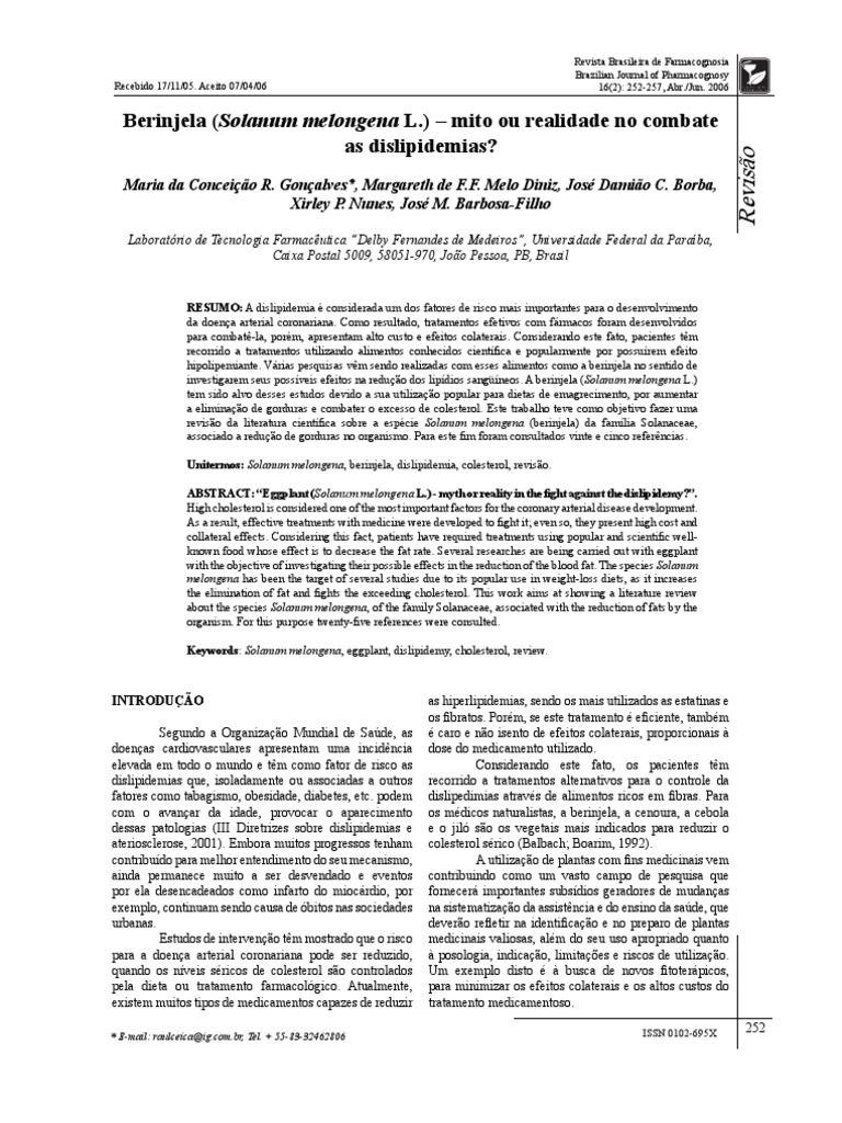 in LDL receptor knock out mice (LDLR(-/-). Food Chem Toxicol 42: 1259-1267. Cintra DEC, Carvalho JCT, Caputo LRG, Vicita WA 2000. Atividade hipocolesterolmica e toxicidade em fase de tratamento sub-crnico do extrato hidroalclico de Solanum melongena (Berinjela). Farmacotcnica e controle de qualidade. Anais do XV Reunio Atualidade de Sociedade de Biologia Experimental. Cruz J, Cruz HMM, Barbosa-Filho JM 1998. Tratamento das Hiperlipidemias. In: Jenner Cruz, Rui Toledo Barros, Helga Maria Mazzarolo Cruz (Org.). Atualidades em Nefrologia 5. Ed. Sarvier. So Paulo v. 5, p. 460-467. III Diretrizes Brasileiras sobre Dislipidemias e Aterosclerose 2001. Publicao do Departamento de Aterosclerose da Sociedade Brasileira de Cardiologia. Data nal de elaborao da verso: 23 de agosto de 2001. Enas LR, Alvarez-Leite J, Botelho FV, Csar GC, Arantes RME 2002. Berinjela (Solanum melongena) aumenta fatores de risco de aterosclerose em modelo de hipercolesterolemia familiar. Anais da IX Semana de Iniciao Cientca da Universidade Federal de Minas Gerais. Guimaraes PR, Galvo AMP, Batista CM, Azevedo GS, Oliveira RD, Lamounier RP, Freire N, Barros AMD, Sakurai E, Oliveira JP, Vieira EC, Alvarez-Leite JI 2000. Eggplant (Solanum melongena) infusion has a modest and transitory effect on hypercholesterolemic subjects. Bras J Med Biol Res 33: 1027-1036. Jenkins DJA, Kendall CWC, Marchie A, Faulkner DA, Wong JMW, Souza R, Emam A, Parker TL, Vidgen E, Trautwein EA, Lapsley KG, Josse RG, Leiter LA, Singer W, Connelly PW 2005. Direct comparison of a dietary portfolio of cholesterol-lowering foods with a statin in hypercholesterolemic participants. Am J Clin Nutr 81: 380-387. Kayamori F, Igarashi K 1994. Effects of dietary nasunin on the serum cholesterol level in rats. Biosci Biotech Biochem 58: 570-571. Kritchevsky D, Tepper AS, Story JA 1975. Inuence of an eggplant (Solanum melongena) preparation on cholesterol metabolism in rats. Exp Pathol Jena 10: 180-183. Kusano G, Takahashi A, Nozoe S, Sonoda Y, Sato Y 1987. Solanum alkaloids as inhibitors of enzmatic conversion of dihydrolanosterol into colesterol. Chem Pharm Bull 35: 4321-4323. Mahan LK, Escott-Stump S 2004. Krauses Food, Nutrition and Diet Therapy. 11e. Singapore, Elsevier. Matos SL, Paula H, Pedrosa ML, Santos RC, Oliveira EL, Chianca-Junior DA, Silva ME 2005. Dietary models for inducing hypercholesterolemia in rats. Braz Arch Biol Technol 48: 203-209. Odetola AA, Iranloye YO, Akinloye O. 2004. Hypolipidaemic potentiais of Solanum melongena and Solanum gilo on hypercholesterolemic rabbits. Pakistan Journal of Nutrition 3: 180-187. Praa JM, Thomaz A, Caramelli B 2004. Eggplant (Solanum melongena) extract does not alter serum lipid levels. Arq Bras Cardiol 82: 269-76. Rackley CEMD 1997. Hypercholesterolemia. Drugs of Today 33: 307-314. Ribeiro-Jorge PAR, Neyra LC, Osaki RM, Almeida E, Bragagnolo N 1998. Efeito da berinjela sobre os