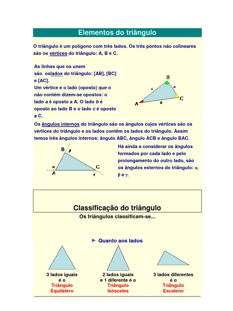 O tringulo um polgono com trs lados. Os trs pontos no colineares so os vrtices do tringulo: A, B e C. As linhas que os unem so oslados do tringulo: [AB], [BC] e [AC]. Um vrtice e o lado (oposto) que o no contm dizem-se opostos: o lado a oposto a A. O lado b oposto ao lado B e o lado c oposto a C. Os ngulos internos do tringulo so os ngulos cujos vrtices so os vrtices do tringulo e os lados contm os lados do tringulo. Assim temos trs ngulos internos: ngulo ABC, ngulo ACB e ngulo BAC. H ainda a considerar os ngulos formados por cada lado e pelo prolongamento do outro lado, so os ngulos externos do tringulo: , e .