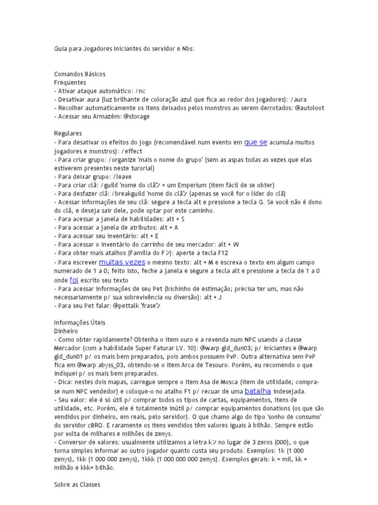 Comandos Bsicos Freqentes - Ativar ataque automtico: /nc - Desativar aura (luz brilhante de colorao azul que fica ao redor dos jogadores): /aura - Recolher automaticamente os itens deixados pelos monstros ao serem derrotados: @autoloot - Acessar seu Armazm: @storage Regulares - Para desativar os efeitos do jogo (recomendvel num evento em que se acumula muitos jogadores e monstros): /effect - Para criar grupo: /organize 'mais o nome do grupo' (sem as aspas todas as vezes que elas estiverem presentes neste turorial) - Para deixar grupo: /leave - Para criar cl: /guild 'nome do cl' + um Emperium (item fcil de se obter) - Para desfazer cl: /breakguild 'nome do cl' (apenas se voc for o lder do cl) - Acessar informaes de seu cl: segure a tecla alt e pressione a tecla G. Se voc no dono do cl, e deseja sair dele, pode optar por este caminho. - Para acessar a janela de habilidades: alt + S - Para acessar a janela de atributos: alt + A - Para acessar seu inventrio: alt + E - Para acessar o inventrio do carrinho de seu mercador: alt + W - Para obter mais atalhos (Famlia do F ): aperte a tecla F12 - Para escrever muitas vezes o mesmo texto: alt + M e escreva o texto em algum campo numerado de 1 a 0; feito isto, feche a janela e segure a tecla alt e pressione a tecla de 1 a 0 onde foi escrito seu texto - Para acessar informaes de seu Pet (bichinho de estimao; precisa ter um, mas no necessariamente p/ sua sobrevivncia ou diverso): alt + J - Para seu Pet falar: @pettalk 'frase' Informaes teis Dinheiro - Como obter rapidamente? Obtenha o item ouro e a revenda num NPC usando a classe Mercador (com a habilidade Super Faturar LV. 10): @warp gld_dun03; p/ iniciantes e @warp gld_dun01 p/ os mais bem preparados, pois ambos possuem PvP. Outra alternativa sem PvP fica em @warp abyss_03, obtendo-se o item Arca de Tesouro. Porm, eu recomendo o que indiquei p/ os mais bem preparados. - Dica: nestes dois mapas, carregue sempre o item Asa de Mosca (item de utilidade; comprase num NPC vendedor) e coloque-o no atalho F1 p/ recuar de uma batalha indesejada. - Seu valor: ele s til p/ comprar todos os tipos de cartas, equipamentos, itens de utilidade, etc. Porm, ele totalmente intil p/ comprar equipamentos donations (os que so vendidos por dinheiro, em reais, pelo servidor). O que chamo algo do tipo 'sonho de consumo' do servidor cBRO. E raramente os itens vendidos tm valores iguais bilho. Sempre esto por volta de milhares e milhes de zenys. - Conversor de valores: usualmente utilizamos a letra k no lugar de 3 zeros (000), o que torna simples informar ao outro jogador quanto custa seu produto. Exemplos: 1k (1 000 zenys), 1kk (1 000 000 zenys), 1kkk (1 000 000 000 zenys). Exemplos gerais: k = mil, kk = milho e kkk= bilho. Sobre as Classes
