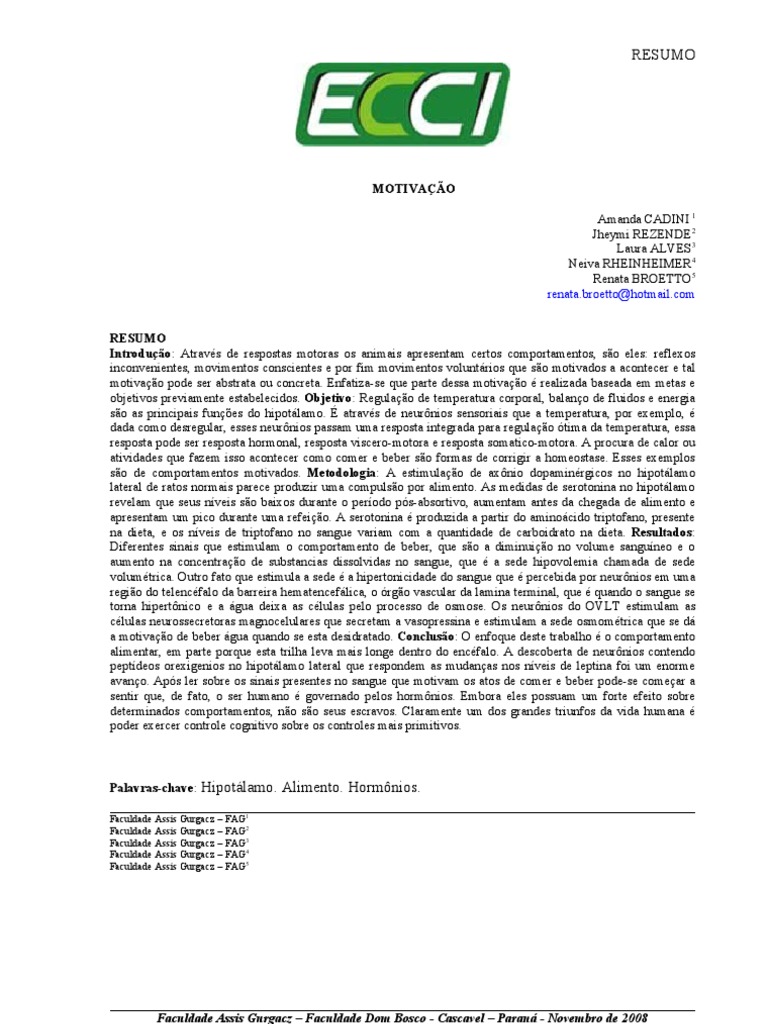 MOTIVAO Amanda CADINI 1 Jheymi REZENDE2 Laura ALVES3 Neiva RHEINHEIMER4 Renata BROETTO5 renata.broetto@hotmail.com RESUMO Introduo: Atravs de respostas motoras os animais apresentam certos comportamentos, so eles: reflexos inconvenientes, movimentos conscientes e por fim movimentos voluntrios que so motivados a acontecer e tal motivao pode ser abstrata ou concreta. Enfatiza-se que parte dessa motivao realizada baseada em metas e objetivos previamente estabelecidos. Objetivo: Regulao de temperatura corporal, balano de fluidos e energia so as principais funes do hipotlamo. atravs de neurnios sensoriais que a temperatura, por exemplo, dada como desregular, esses neurnios passam uma resposta integrada para regulao tima da temperatura, essa resposta pode ser resposta hormonal, resposta viscero-motora e resposta somatico-motora. A procura de calor ou atividades que fazem isso acontecer como comer e beber so formas de corrigir a homeostase. Esses exemplos so de comportamentos motivados. Metodologia: A estimulao de axnio dopaminrgicos no hipotlamo lateral de ratos normais parece produzir uma compulso por alimento. As medidas de serotonina no hipotlamo revelam que seus nveis so baixos durante o perodo ps-absortivo, aumentam antes da chegada de alimento e apresentam um pico durante uma refeio. A serotonina produzida a partir do aminocido triptofano, presente na dieta, e os nveis de triptofano no sangue variam com a quantidade de carboidrato na dieta. Resultados: Diferentes sinais que estimulam o comportamento de beber, que so a diminuio no volume sanguneo e o aumento na concentrao de substancias dissolvidas no sangue, que a sede hipovolemia chamada de sede volumtrica. Outro fato que estimula a sede a hipertonicidade do sangue que percebida por neurnios em uma regio do telencfalo da barreira hematenceflica, o rgo vascular da lamina terminal, que quando o sangue se torna hipertnico e a gua deixa as clulas pelo processo de osmose. Os neurnios do OVLT estimulam as clulas neurossecretoras magnocelulares que secretam a vasopressina e estimulam a sede osmomtrica que se d a motivao de beber gua quando se esta desidratado. Concluso: O enfoque deste trabalho o comportamento alimentar, em parte porque esta trilha leva mais longe dentro do encfalo. A descoberta de neurnios contendo peptdeos orexigenios no hipotlamo lateral que respondem as mudanas nos nveis de leptina foi um enorme avano. Aps ler sobre os sinais presentes no sangue que motivam os atos de comer e beber pode-se comear a sentir que, de fato, o ser humano governado pelos hormnios. Embora eles possuam um forte efeito sobre determinados comportamentos, no so seus escravos. Claramente um dos grandes triunfos da vida humana poder exercer controle cognitivo sobre os controles mais primitivos.
