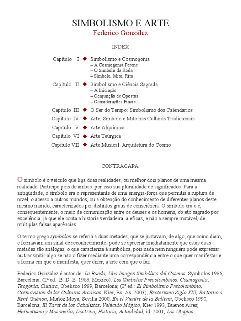 realidade. Participa pois de ambas: por isso sua pluralidade de significados. Para a antigidade, o smbolo era o representante de uma energia-fora que permitia a ruptura de nvel, o acesso a outros mundos, ou a obteno do conhecimento de diferentes planos deste mesmo mundo, caracterizados por distintos graus de conscincia. O smbolo era e , conseqentemente, o meio de comunicao entre os deuses e os homens, objeto sagrado por excelncia, j que ele conta a histria verdadeira, a eficaz, e no a sempre mutvel, de mltiplas falsas aparncias. O termo grego symbolon se referia a duas metades, que se juntavam, de algo, que coincidiam, e formavam um sinal de reconhecimento; pode se apreciar imediatamente que estas duas metades so anlogas, o que caracteriza simblica, pois nada nem ningum pode expressar ou transmitir algo se no o fizer mediante uma correspondncia entre o que quer manifestar e a forma em que o manifesta, quer dizer, a arte com que o faz. Federico Gonzlez autor de: La Rueda, Una Imagen Simblica del Cosmos, Symbolos 1986, Barcelona; (2 ed.: B. D. E. 1988, Mxico); Los Smbolos Precolombinos, Cosmogona, Teogona, Cultura, Obelisco 1989, Barcelona; (2 ed.: El Simbolismo Precolombino, Cosmovisin de las Culturas Arcaicas, Kier, Bs. As. 2003); Esoterismo Siglo XXI, En torno a Ren Gunon, Muoz Moya, Sevilla 2000; En el Vientre de la Ballena, Obelisco 1990, Barcelona; El Tarot de los Cabalistas, Vehculo Mgico, Kier 1993, Buenos Aires; Hermetismo y Masonera, Doctrina, Historia, Actualidad, id. 2001; Las Utopas