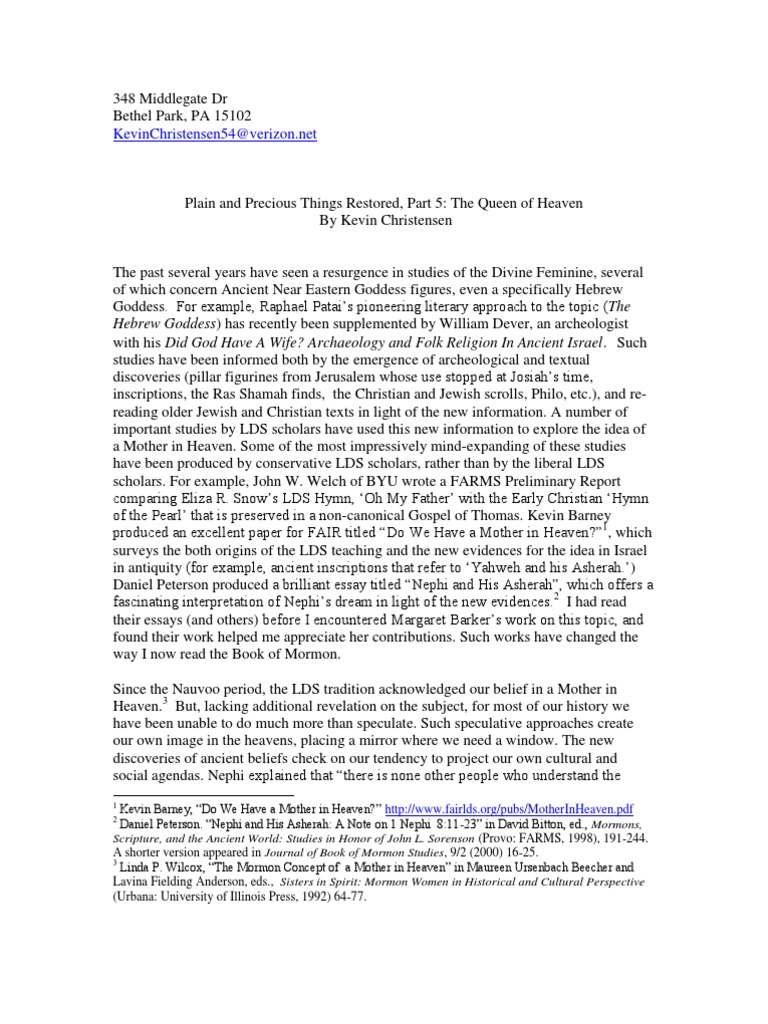 Kevin Barney, “Do We Have a Mother in Heaven?” http://www.fairlds.org/pubs/MotherInHeaven.pdf Daniel Peterson. “Nephi and His Asherah: A Note on 1 Nephi 8:11 -23” in David Bitton, ed., Mormons, Scripture, and the Ancient World: Studies in Honor of John L. Sorenson (Provo: FARMS, 1998), 191-244. A shorter version appeared in Journal of Book of Mormon Studies, 9/2 (2000) 16-25. 3 Linda P. Wilcox, “The Mormon Concept of a Mother in Heaven” in Maureen Ursenbach Beecher and Lavina Fielding Anderson, eds., Sisters in Spirit: Mormon Women in Historical and Cultural Perspective (Urbana: University of Illinois Press, 1992) 64-77.