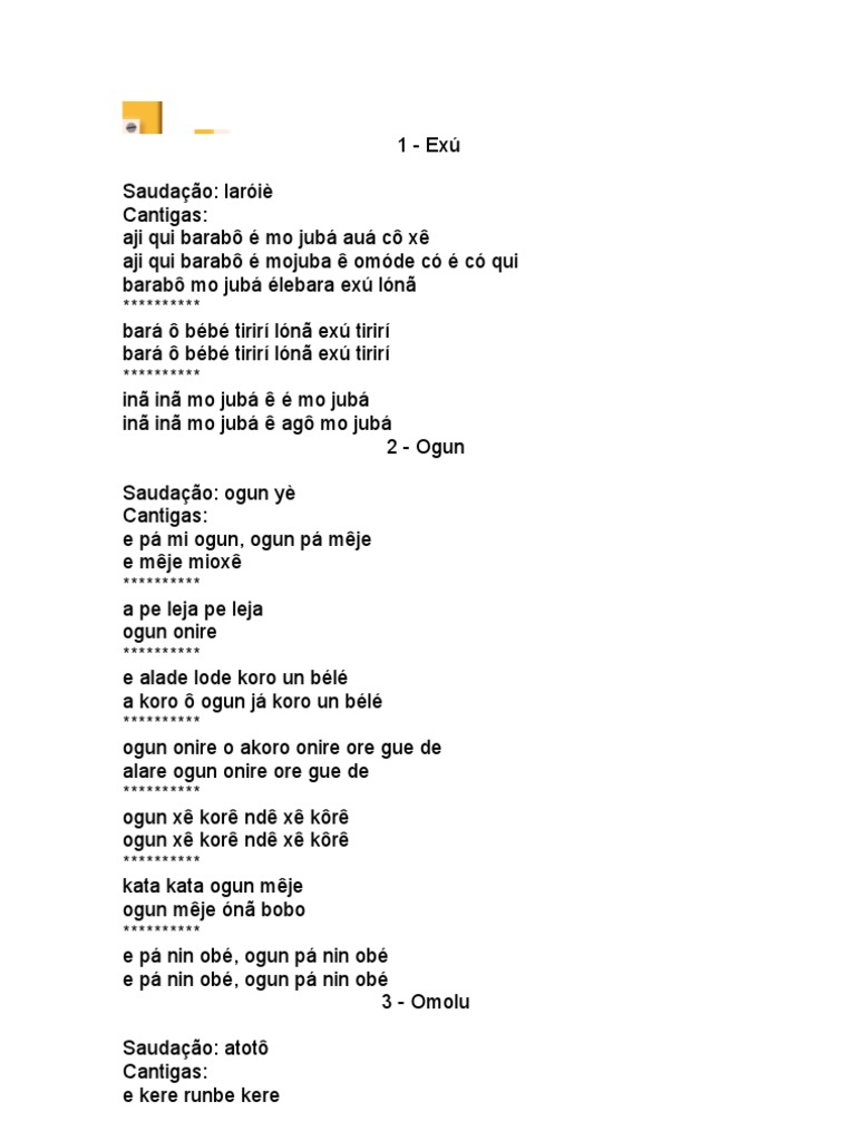 jub lebara ex ln ********** bar bb tirir ln ex tirir bar bb tirir ln ex tirir ********** in in mo jub mo jub in in mo jub ag mo jub 2 - Ogun Saudao: ogun y Cantigas: e p mi ogun, ogun p mje e mje miox ********** a pe leja pe leja ogun onire ********** e alade lode koro un bl a koro ogun j koro un bl ********** ogun onire o akoro onire ore gue de alare ogun onire ore gue de ********** ogun x kor nd x kr ogun x kor nd x kr ********** kata kata ogun mje ogun mje n bobo ********** e p nin ob, ogun p nin ob e p nin ob, ogun p nin ob 3 - Omolu Saudao: atot Cantigas: e kere runbe kere