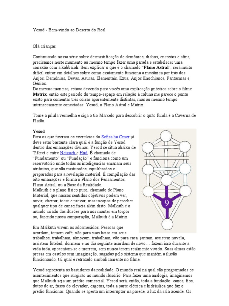 e afins, precisamos neste momento ao mesmo tempo fazer uma parada e estabelecer uma conexão com a kabbalah. Sem explicar o que é o chamado “Plano Astral”, será muito difícil entrar em detalhes sobre como exatamente funciona a mecânica por trás dos Anjos, Demônios, Devas, Asuras, Elementais, Exus, Anjos Enochianos, Fantasmas e Gênios. Da mesma maneira, estava devendo para vocês uma explicação gnóstica sobre o filme Matrix, então este período do tempo-espaço em relação à coluna me parece o ponto exato para comentar três coisas aparentemente distintas, mas ao mesmo tempo intrinsecamente conectadas: Yesod, o Plano Astral e Matrix. Tome a pílula vermelha e siga o tio Marcelo para descobrir o quão funda é a Caverna de Platão. Yesod Para os que fizeram os exercícios do Sefira ha Omer já deve estar bastante clara qual é a função de Yesod dentro das emanações divinas. Yesod se situa abaixo de Tiferet e entre Netzach e Hod. É chamada de “Fundamento” ou “Fundação” e funciona como um reservatório onde todas as inteligências emanam seus atributos, que são misturados, equilibrados e preparados para a revelação material. É compilação das oito emanações e forma o Plano dos Pensamentos, Plano Astral, ou a Base da Realidade. Malkuth é o plano físico puro, chamado de Plano Material, que nossos sentidos objetivos podem ver, ouvir, cheirar, tocar e provar, mas incapaz de perceber qualquer tipo de consciência além disto. Malkuth é o mundo criado das ilusões para nos manter em torpor ou, fazendo nossa comparação, Malkuth é a Matrix. Em Malkuth vivem os adormecidos. Pessoas que acordam, tomam café, vão para suas baias em seus trabalhos, trabalham, almoçam, trabalham, vão para casa, jantam, assistem novela, assistem futebol, dormem e no dia seguinte acordam de novo… fazem isso durante a vida toda, aposentam-se e morrem, sem nunca terem realmente vivido. Suas almas estão presas em casulos sem imaginação, sugadas pelo sistema que mantém a ilusão funcionando, tal qual é retratado simbolicamente no filme. Yesod representa os bastidores da realidade. O mundo real na qual são programados os acontecimentos que surgirão no mundo ilusório. Para fazer uma analogia, imaginemos que Malkuth seja um prédio comercial. Yesod será, então, toda a fundação: canos, fios, dutos de ar, fosso do elevador, esgotos, toda a parte elétrica e hidráulica que faz o prédio funcionar. Quando se aperta um interruptor na parede, a luz da sala acende. Os
