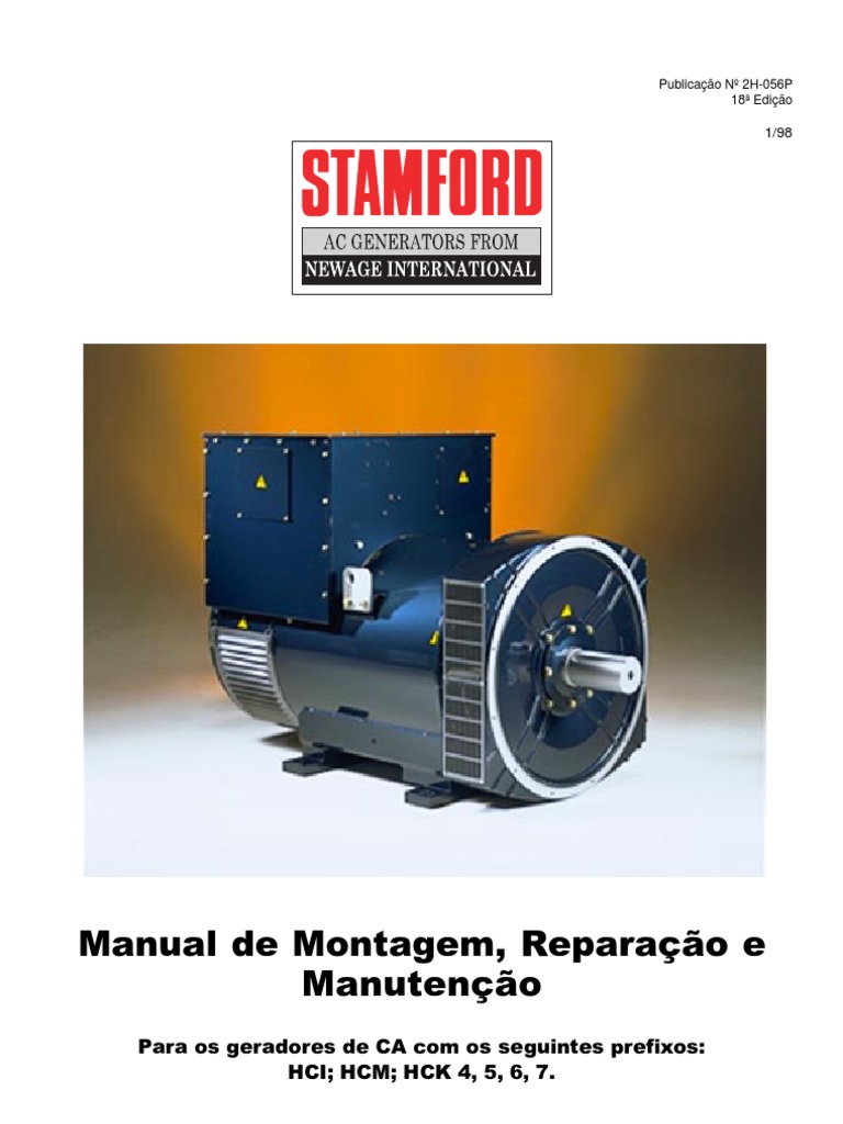 A finalidade deste Manual a de proporcionar ao utilizador do gerador Stamford o conhecimento dos seus princpios de funcionamento, do critrio com que o gerador foi concebido e dos procedimentos de instalao e manuteno. reas especficas onde a falta de cuidado ou uso incorrecto possam provocar danos no equipamento e/ou ferimentos pessoais so realadas com notas de AVISO e/ou CUIDADO , e IMPORTANTE que o contedo deste Manual seja lido e compreendido antes de se proceder montagem ou ao uso deste gerador. O pessoal de Servio, Vendas e Tcnico de Newage Internacional est sempre pronto a ajudar e todas as consultas feitas companhia sero bem atendidas. Instalao, funcionamento, reparao ou substituio de peas de forma incorrecta pode resultar em ferimentos pessoais graves ou morte e/ou danos ao equipamento. O pessoal de reparaes tem de estar qualificado para efectuar reparaes elctricas e mecnicas.