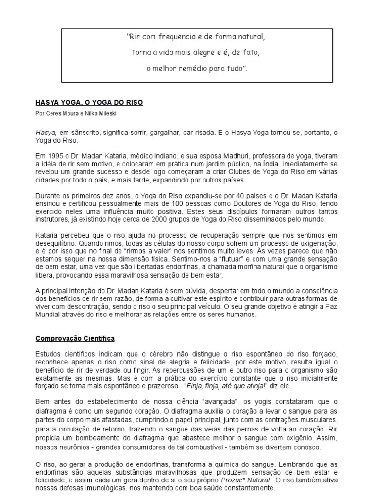 Hasya, em snscrito, significa sorrir, gargalhar, dar risada. E o Hasya Yoga tornou-se, portanto, o Yoga do Riso. Em 1995 o Dr. Madan Kataria, mdico indiano, e sua esposa Madhuri, professora de yoga, tiveram a idia de rir sem motivo, e colocaram em prtica num jardim pblico, na ndia. Imediatamente se revelou um grande sucesso e desde logo comearam a criar Clubes de Yoga do Riso em vrias cidades por todo o pas, e mais tarde, expandindo por outros pases. Durante os primeiros dez anos, o Yoga do Riso expandiu-se por 40 pases e o Dr. Madan Kataria ensinou e certificou pessoalmente mais de 100 pessoas como Doutores de Yoga do Riso, tendo exercido neles uma influncia muito positiva. Estes seus discpulos formaram outros tantos instrutores, j existindo hoje cerca de 2000 grupos de Yoga do Riso disseminados pelo mundo. Kataria percebeu que o riso ajuda no processo de recuperao sempre que nos sentimos em desequilbrio. Quando rimos, todas as clulas do nosso corpo sofrem um processo de oxigenao, e por isso que no final de rirmos a valer nos sentimos muito leves. s vezes parece que no estamos sequer na nossa dimenso fsica. Sentimo-nos a flutuar e com uma grande sensao de bem estar, uma vez que so libertadas endorfinas, a chamada morfina natural que o organismo libera, provocando essa maravilhosa sensao de bem estar. A principal inteno do Dr. Madan Kataria sem dvida, despertar em todo o mundo a conscincia dos benefcios de rir sem razo, de forma a cultivar este esprito e contribuir para outras formas de viver com descontrao, sendo o riso o seu principal veculo. O seu grande objetivo atingir a Paz Mundial atravs do riso e melhorar as relaes entre os seres humanos. Comprovao Cientfica Estudos cientficos indicam que o crebro no distingue o riso espontneo do riso forado, reconhece apenas o riso como sinal de alegria e felicidade, por este motivo, resulta igual o benefcio de rir de verdade ou fingir. As repercusses de um e outro riso para o organismo so exatamente as mesmas. Mas com a prtica do exerccio constante que o riso inicialmente forado se torna mais espontneo e prazeroso. "Finja, finja, at que atinja! diz ele. Bem antes do estabelecimento de nossa cincia avanada, os yogis constataram que o diafragma como um segundo corao. O diafragma auxilia o corao a levar o sangue para as partes do corpo mais afastadas, cumprindo o papel principal, junto com as contraes musculares, para a circulao de retorno, trazendo o sangue das veias das pernas de volta ao corao. Rir propicia um bombeamento do diafragma que abastece melhor o sangue com oxignio. Assim, nossos neurnios - grandes consumidores de tal combustvel - tambm se divertem conosco. O riso, ao gerar a produo de endorfinas, transforma a qumica do sangue. Lembrando que as endorfinas so aquelas substncias maravilhosas que produzem sensao de bem estar e felicidade, e assim cada um gera dentro de si o seu prprio Prozac* Natural. O riso tambm ativa nossas defesas imunolgicas, nos mantendo com boa sade constantemente.